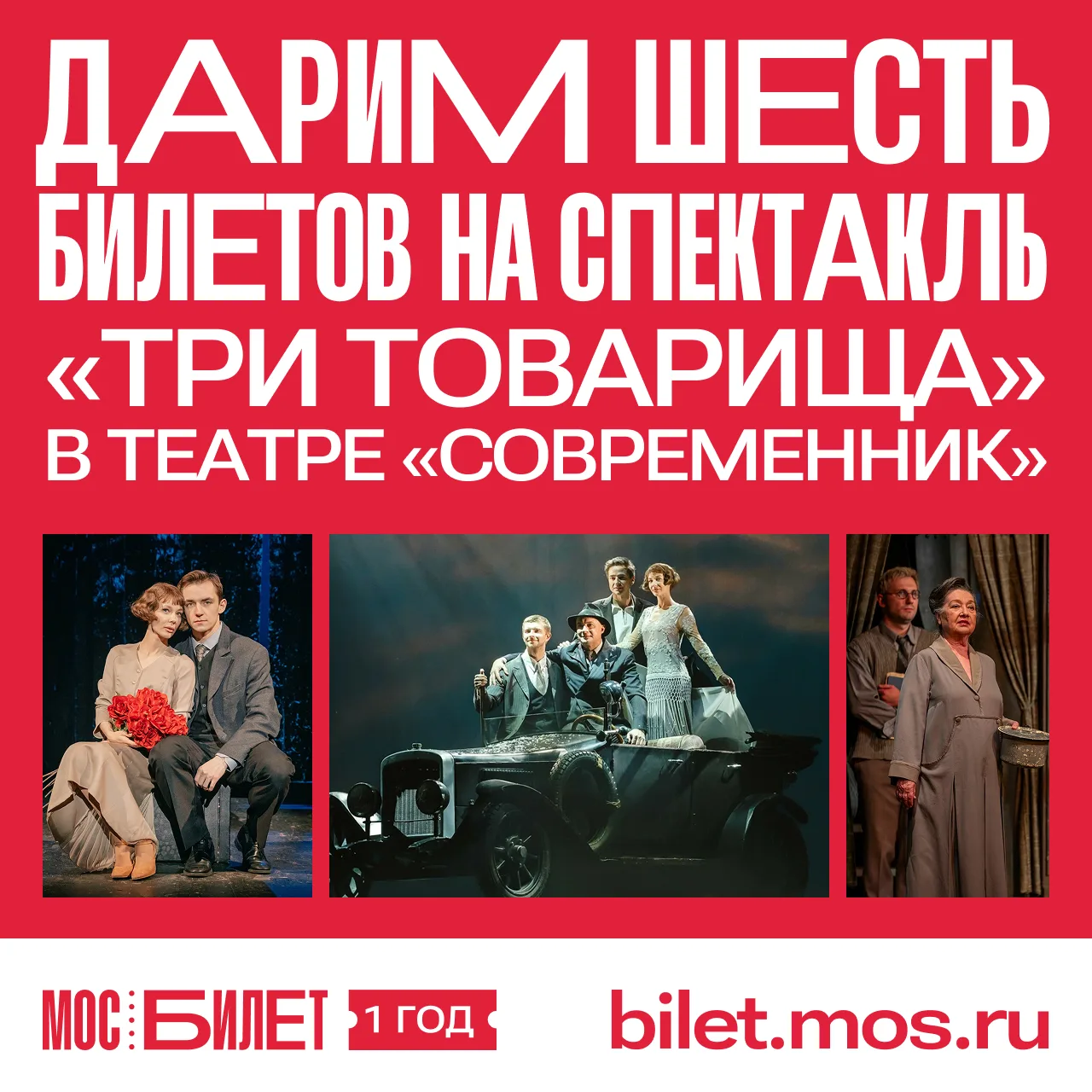 🎭 Если давно хотели сходить в театр «Современник» — вот отличный повод. Дарим шесть билетов на спектакль «Три товарища», который пройдет 10 апреля.