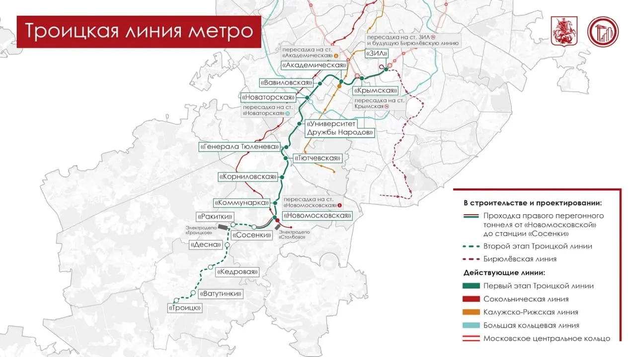 💬 Южный участок линии пройдёт вдоль Калужского шоссе — от Коммунарки до Троицка. Здесь откроются шесть станций: «Сосенки», «Ракитки», «Десна», «Кедровая», «Ватутинки», «Троицк»