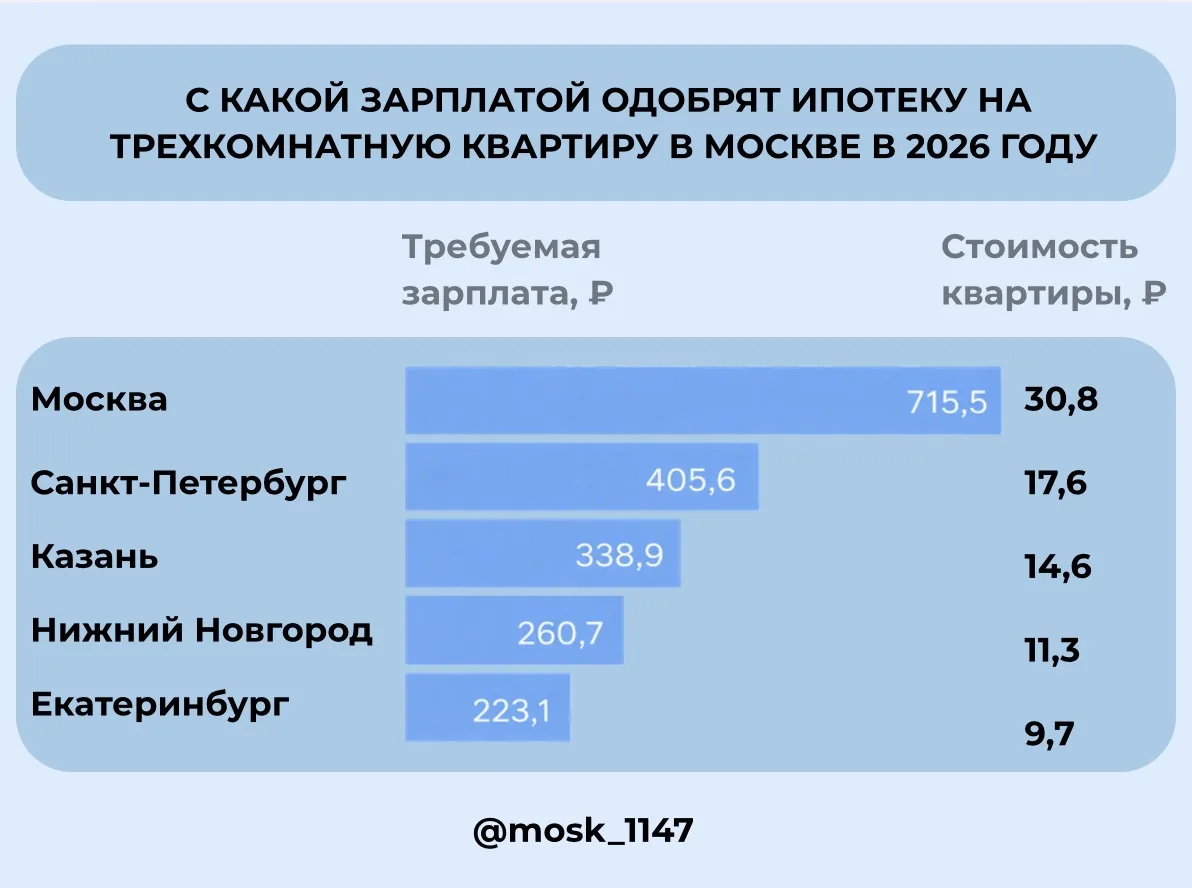 😢 Чтобы взять трёшку в ипотеку в Москве, нужно зарабатывать около 700 тысяч рублей в месяц