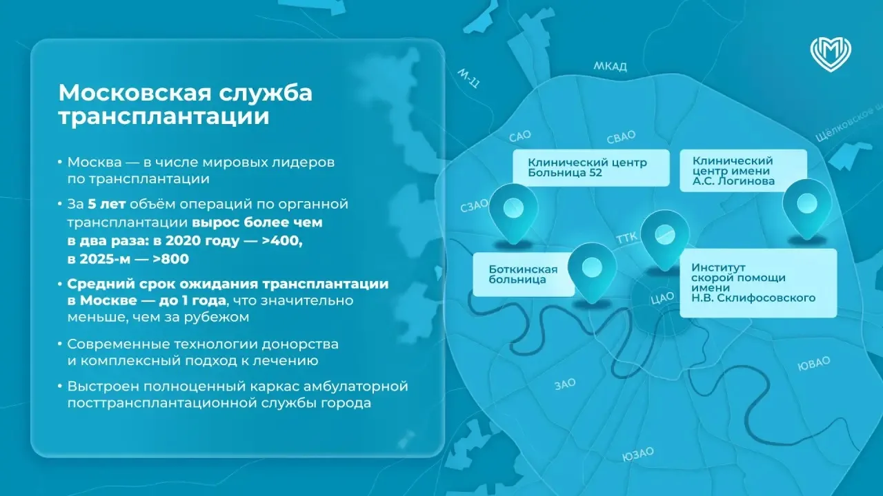 Объём операций по пересадке органов в столице за последние пять лет увеличился более чем в два раза: с 428 в 2020 году до 859 в прошлом. Пациенты стали получать помощь быстрее — пересадку печени сейчас ждут около пяти месяцев, почки — до года, тогда как во многих странах ожидание может занимать несколько лет