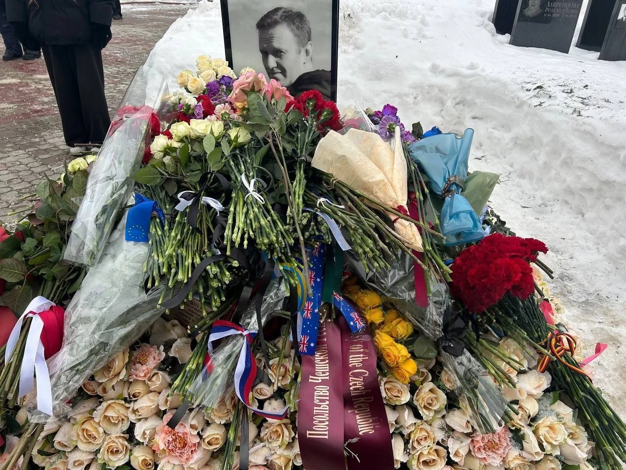 На кладбище также пришли представители посольств Германии, Италии, Польши и Латвии. На букетах — ленты с флагами России, Эстонии и Евросоюза