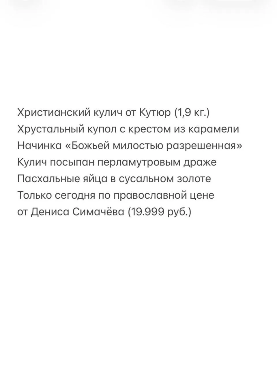 Ой, тут Денис Симачёв поднял цену до 50 000₽ на свой кулич в преддверии Пасхи