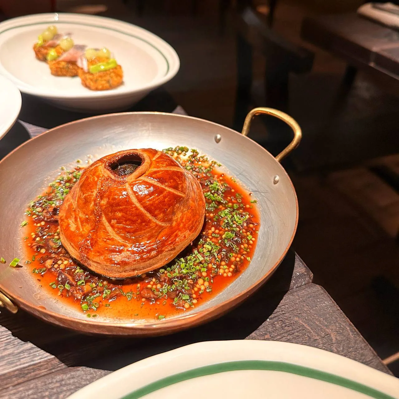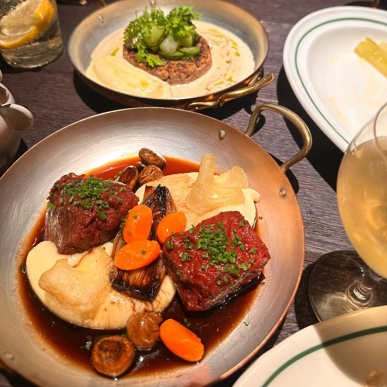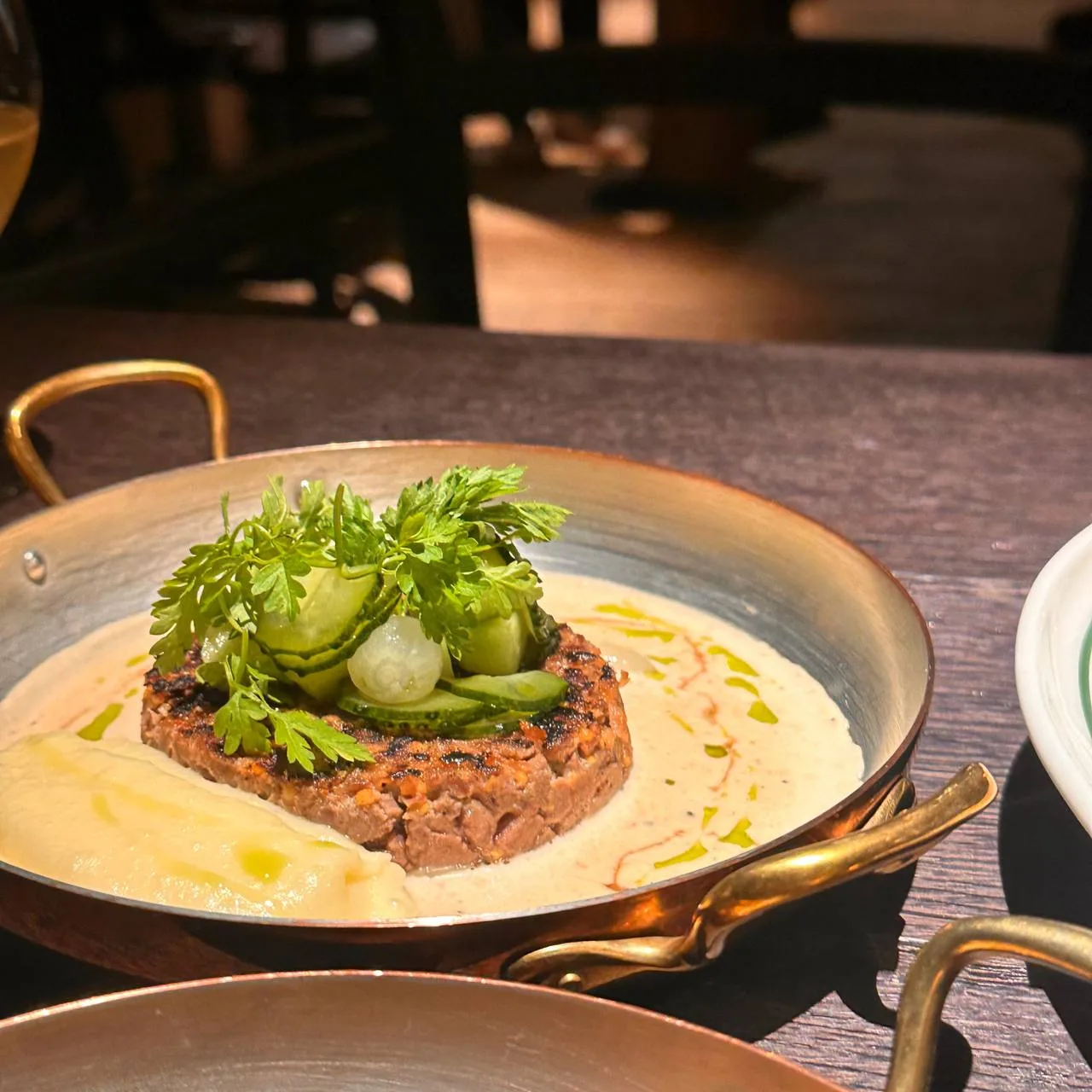 Шеф Ренат Царицанский предлагает свою версию кухни севера Франции, где, к слову, место находится и традиционных «нашим» сочетаниям. Так, редакция однозначно оценила картофельный дофин с сельдью и укропным кремом, ну и самое любимое блюдо шефа, которое, по его признанию, готовится больше суток, но стоит того — пате-ан-крут. Запечённое ассорти мяса в маслянистом песочном тесте подаётся с маринованными огурцами, мочёной вишней и горчицей. Такой нежности у этого старинного французского блюда в Москве не встречали. Луковый суп чуть легче классического, с кисловатой нотой и более живой текстурой, но богатым ароматом. А вот питивье, закрытому пирогу с томлёным мясом, явно не хватало нежности, и его не спасал даже соус с черносливом. Зато рубленый стейк аше с картофельным пюре не подвёл — сочно и, к слову, на классическую «котлетку с пюре» совсем не похоже.