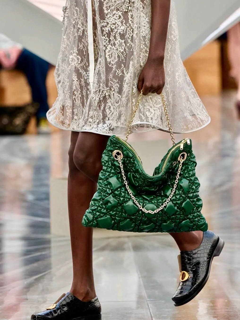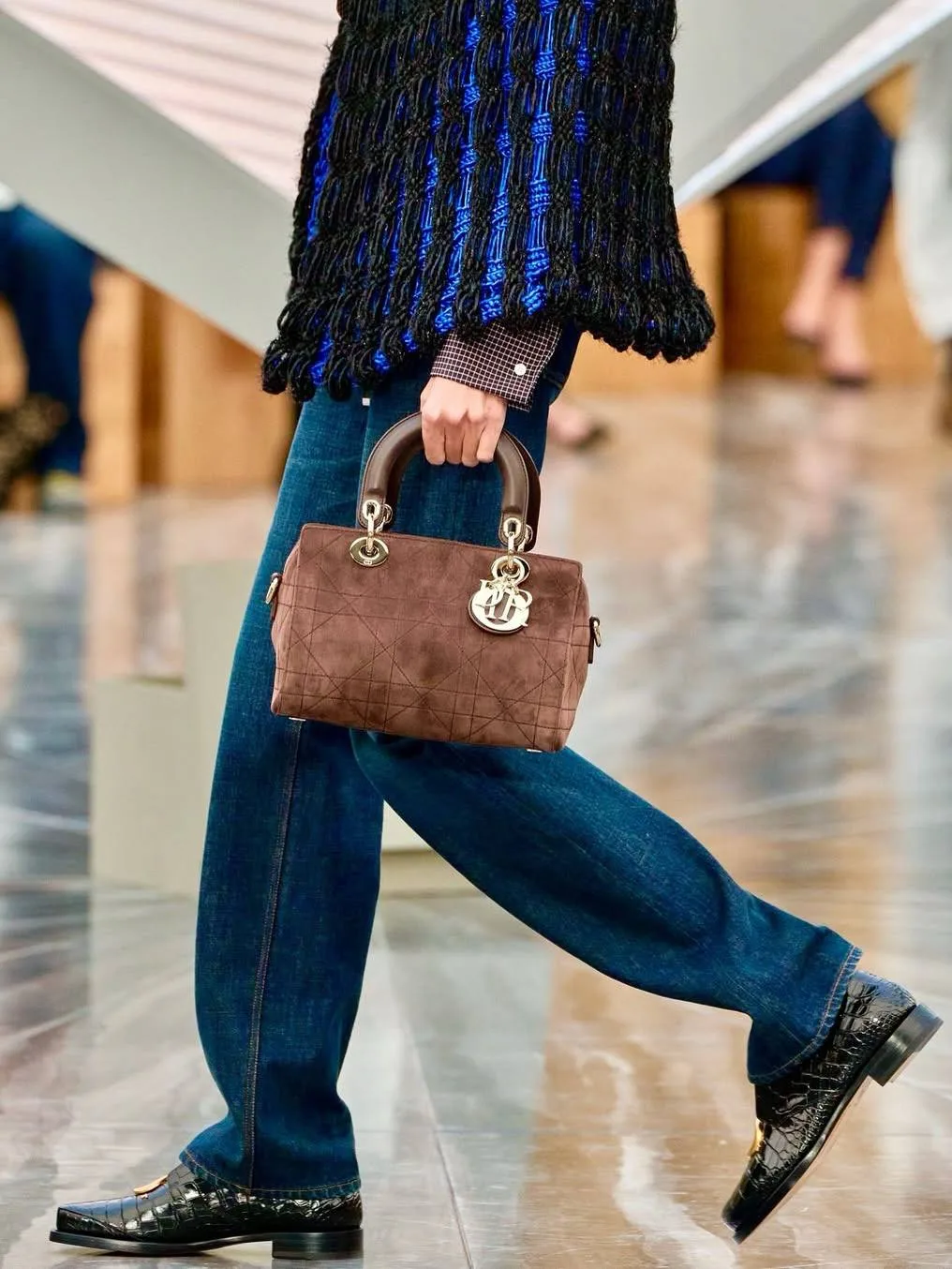 И если бар-жакет он не сильно переосмыслил, то ключевой аксессуар — Lady Dior — получил выраженную «перепрошивку».