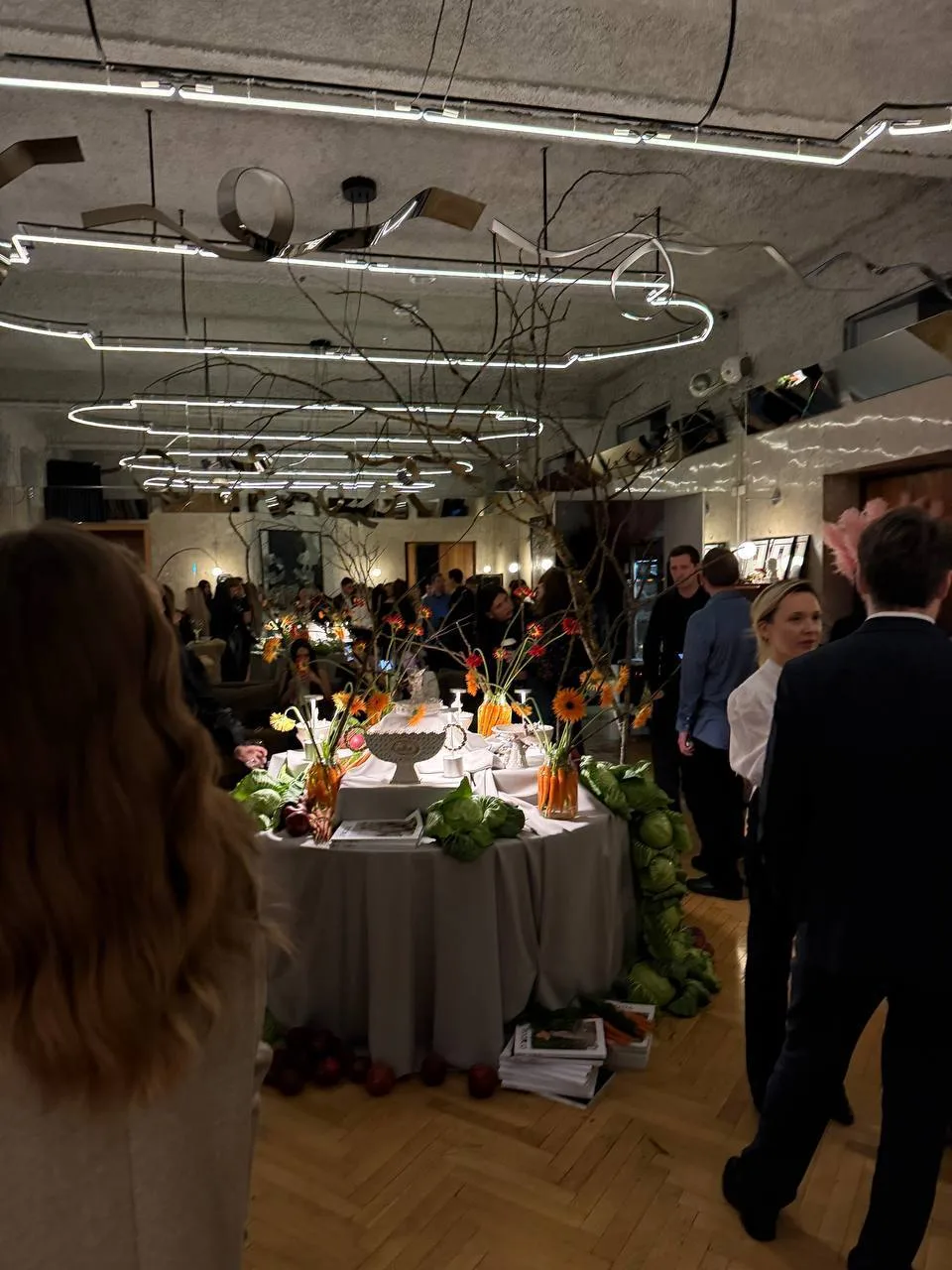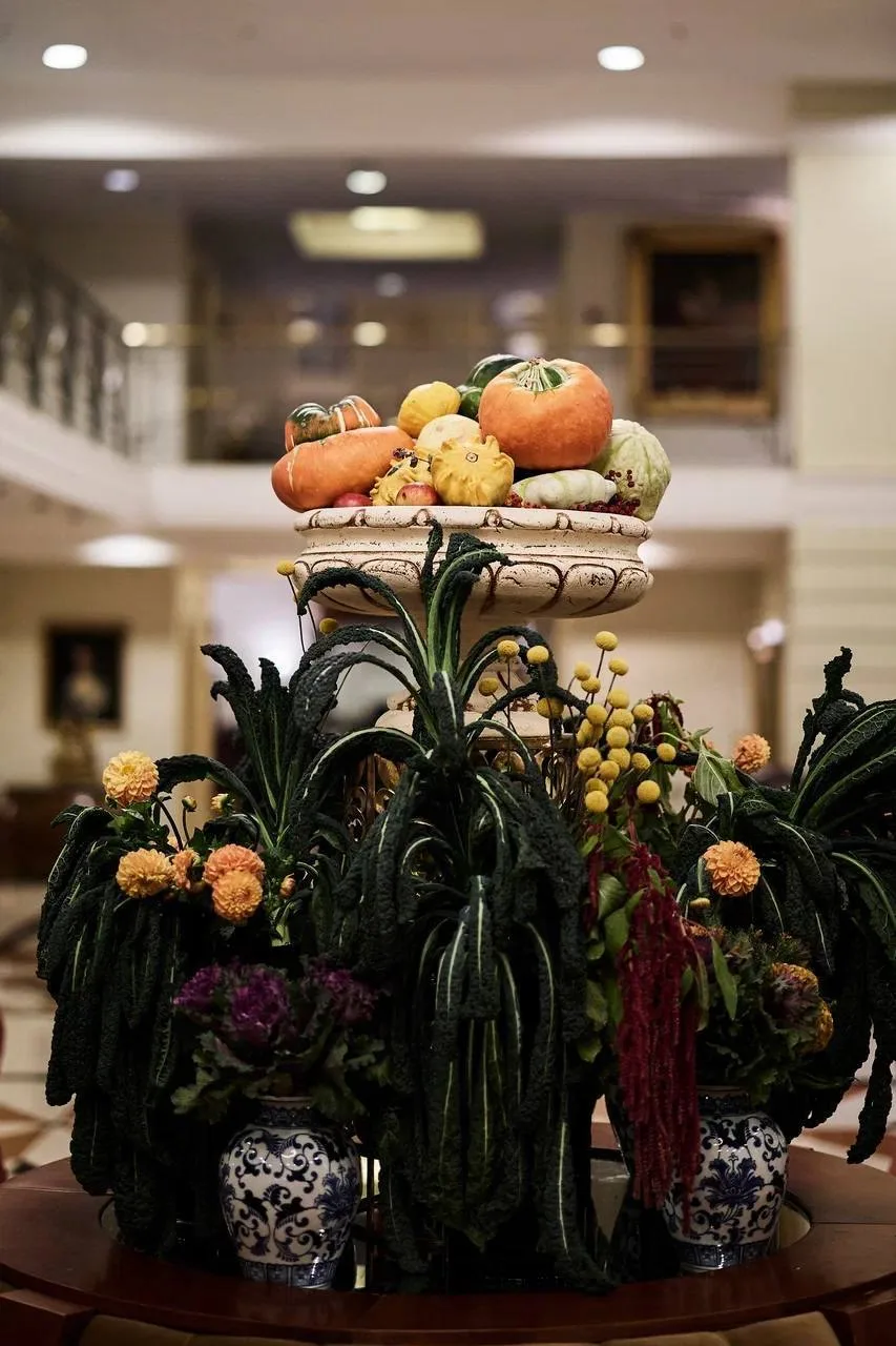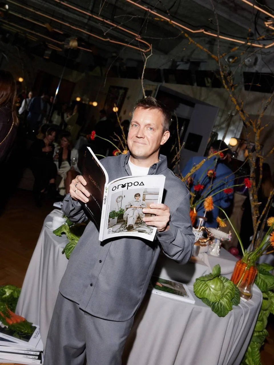 Закуски на афтепати вторят агрокультурной теме, как и фотозона с обилием овощей, яблок и злаков. Гостям подают холодец, борщ с салом, оливье, винегрет, бефстроганов и прочая классика. А на десерт — трубочки со сгущёнкой. Что еще нужно к середине октября!