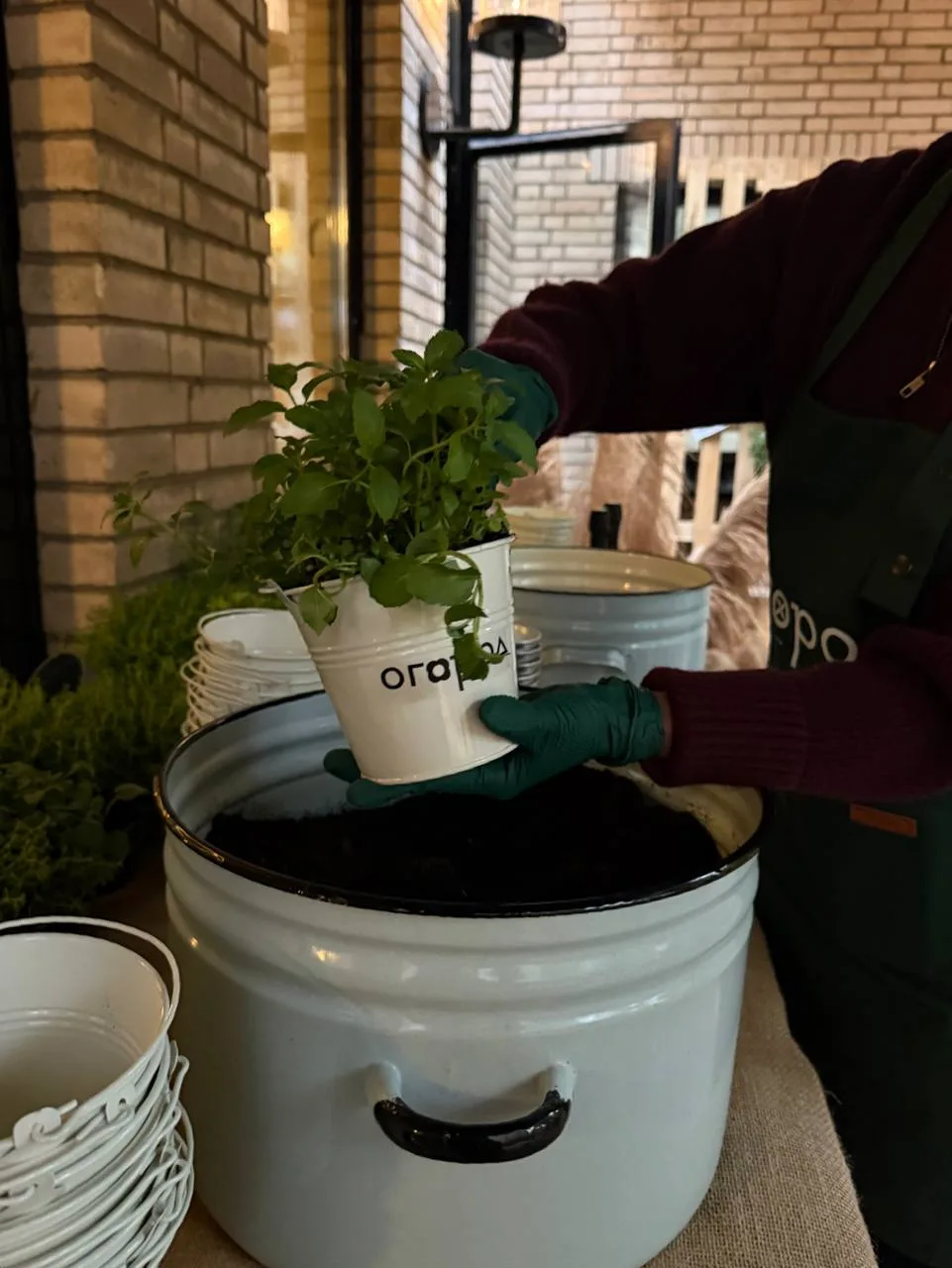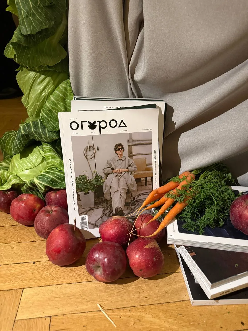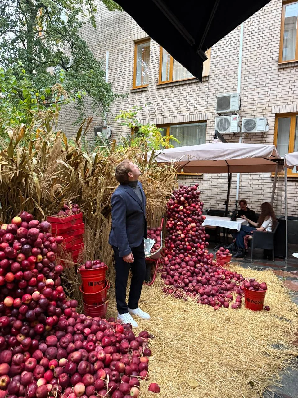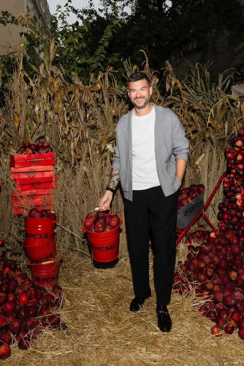 Отдельная деталь — сет-дизайн с овощами, яблоками, колосьями и шкатулками Никиты Макарова. А также брендированные фартуки, дождевики и резиновые ботинки, которые, кстати, использовались по назначению. Гости надевали их, чтобы поучаствовать в мастер-классе по посадке растений в горшок. Любой мог высадить понравившуюся агрокультуру в ведёрко и забрать с собой.