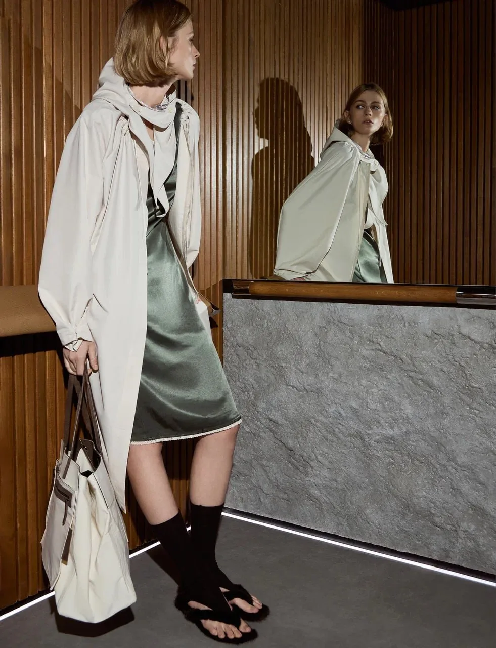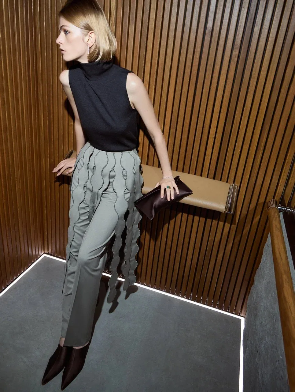 Лифты КМЗ узнают пассажиров по смартфону, сами предотвращают поломки и движутся со скоростью 4 м/с. А ещё, как оказалось, отлично сочетаются с оттенками голубого, зелёного и даже чёрного в платье Fashion Rebels, вьетнамках Ruban, топе и пальто Ivolga.