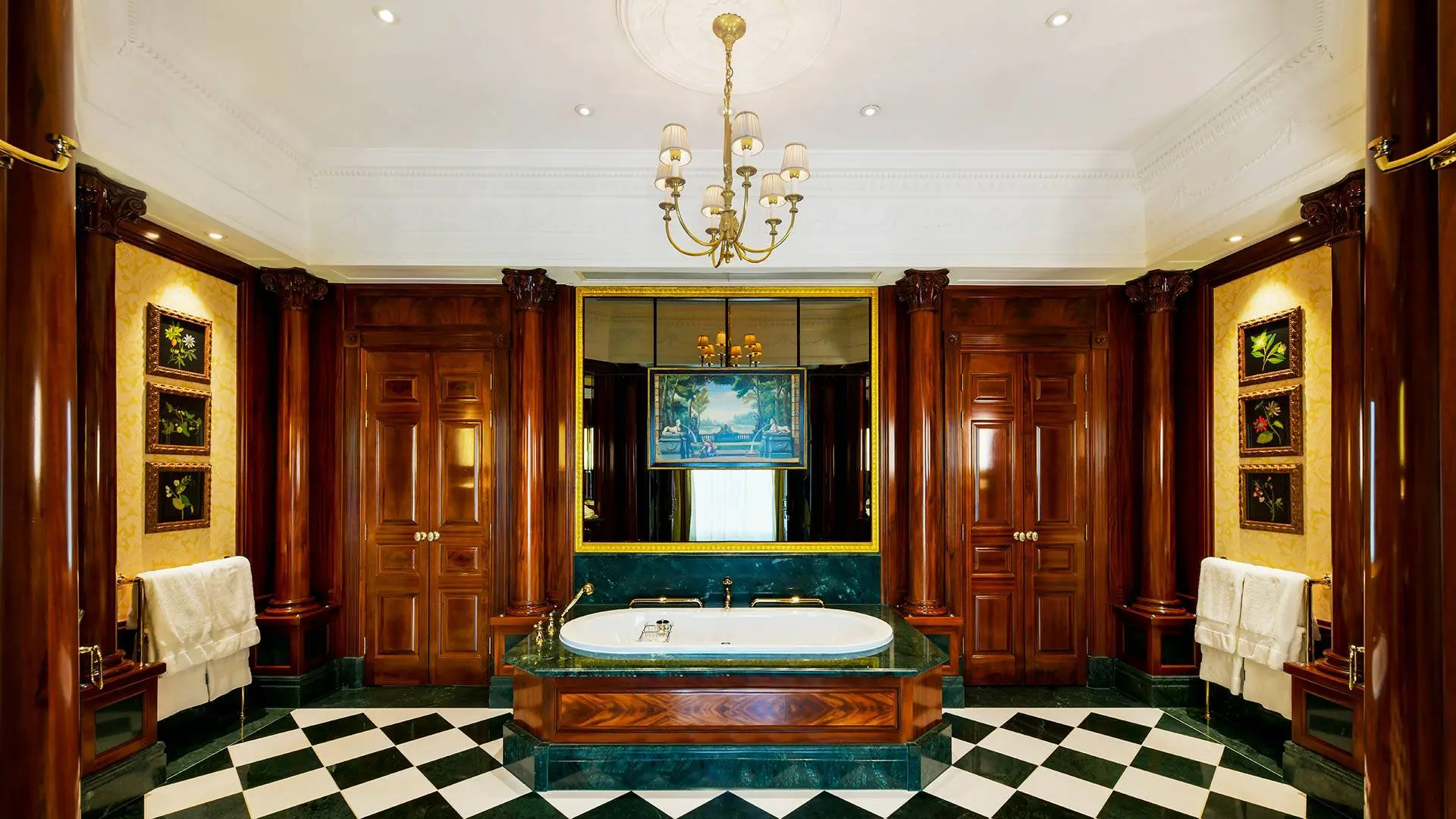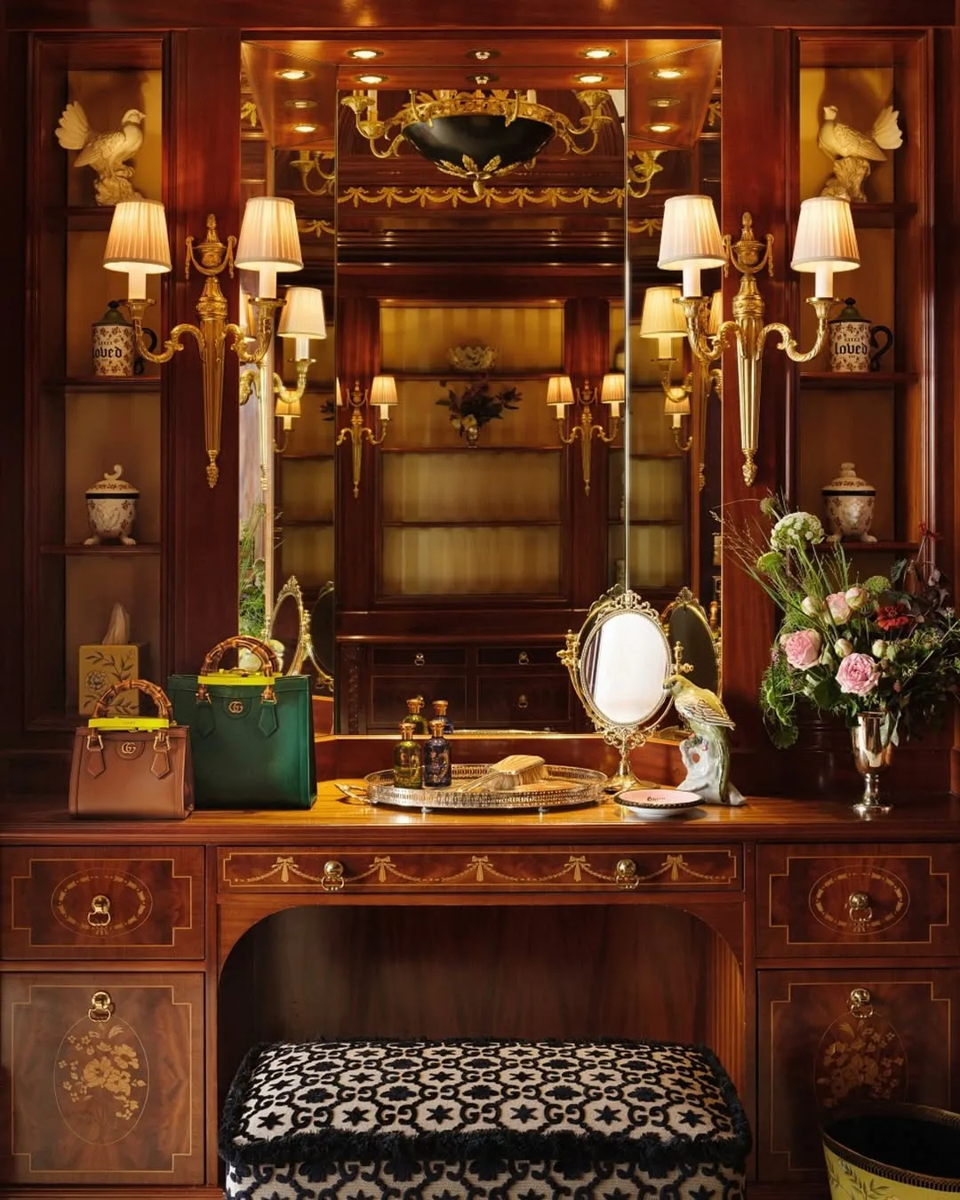 Безупречный сьют занимает весь фасад пятого этажа, откуда открывается вид на Темзу. Эдвардианские стены обрамляют видение Gucci Алессандро Микеле: бархат, зеркала, гобелены и предметы мебели, отобранные вместе с аукционом Christie’s.