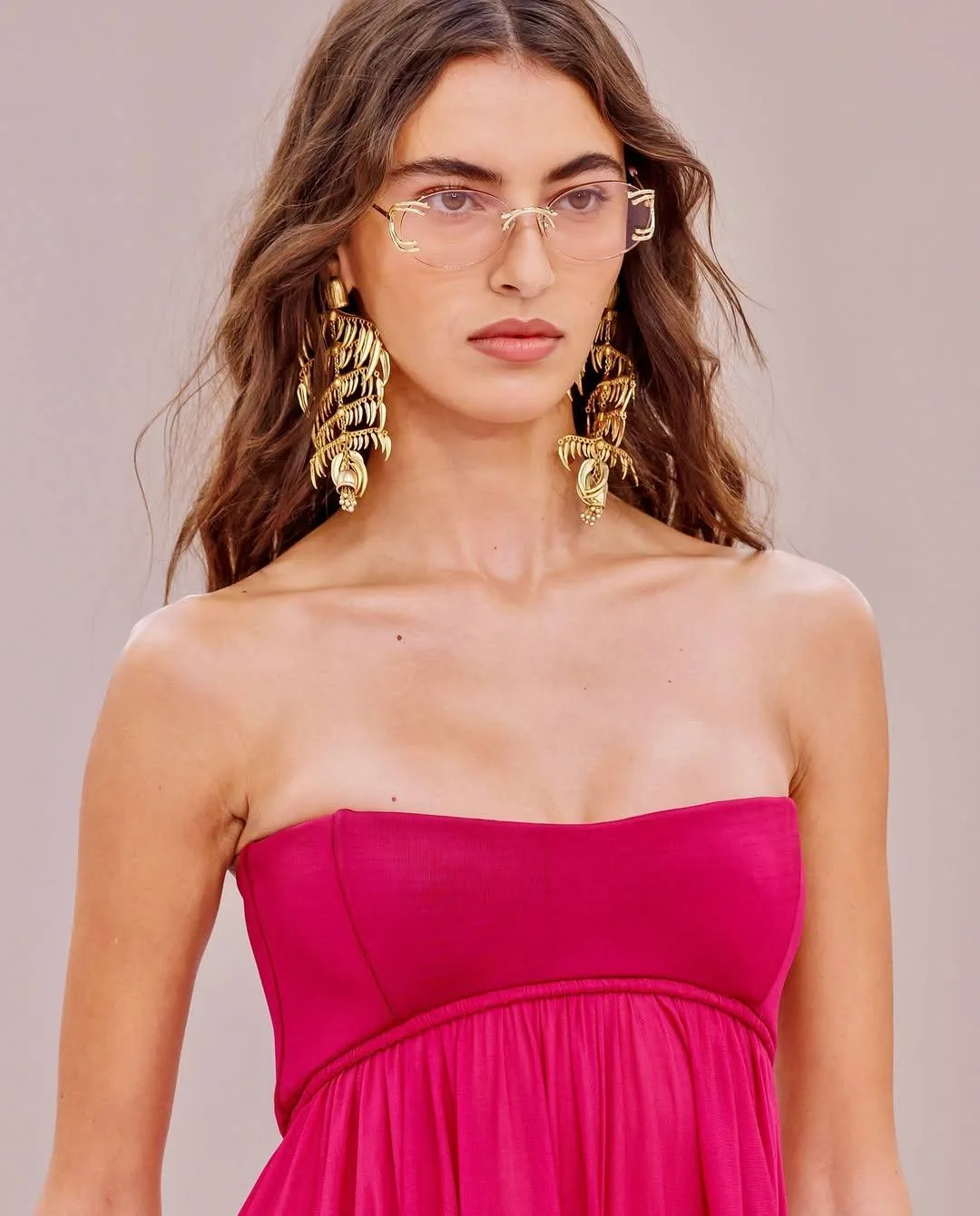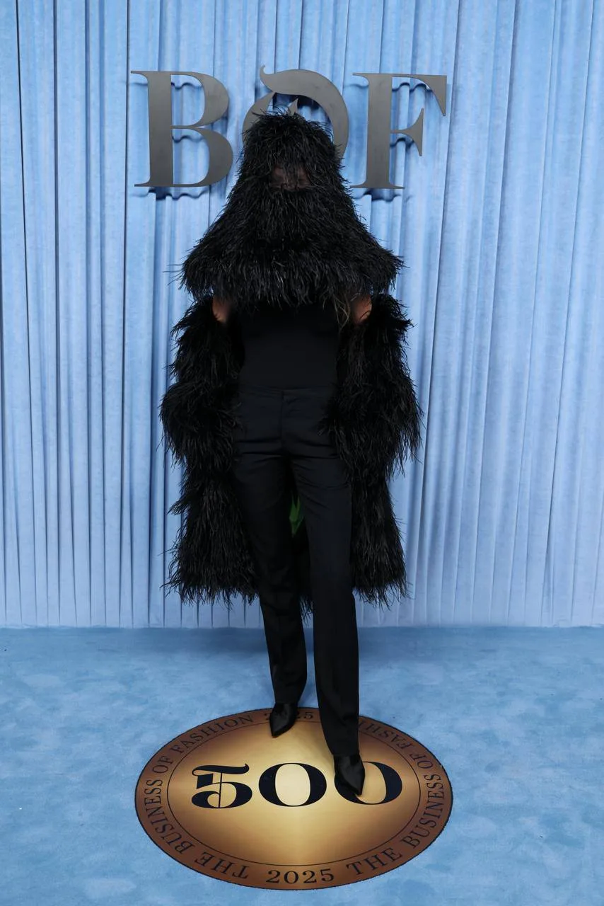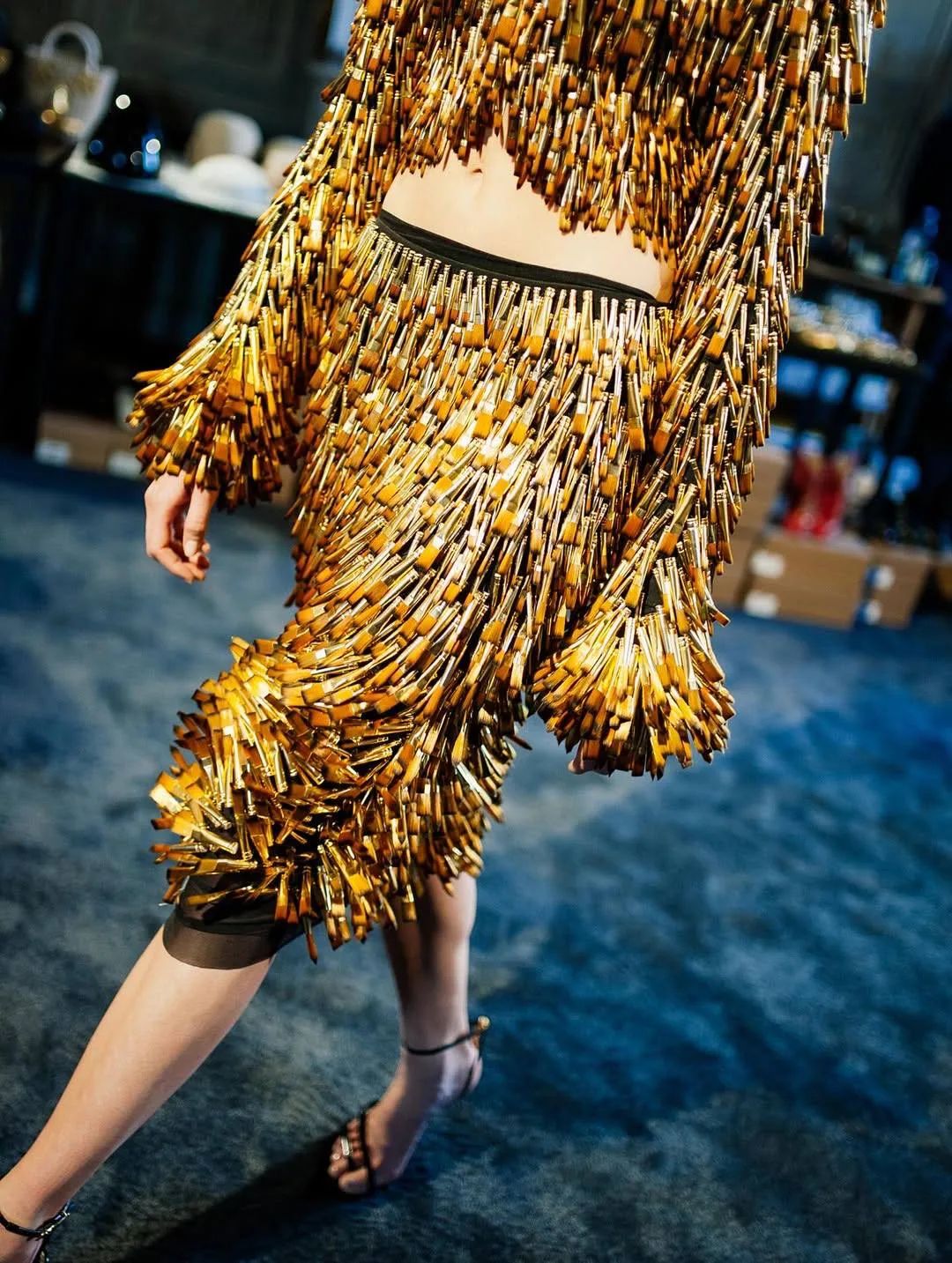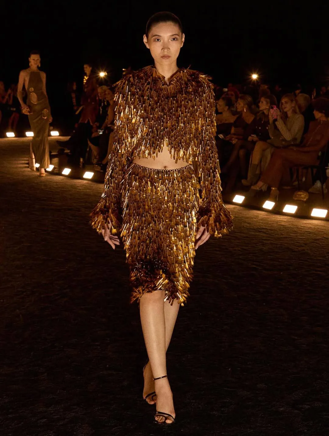 Один из самых необычных образов на Парижской неделе моды — встречен в коллекции Schiaparelli ss’26. Кардиган, полностью расшитый 6 000 золотыми латунными кисточками, и юбка-карандаш «в тон» 🖌️