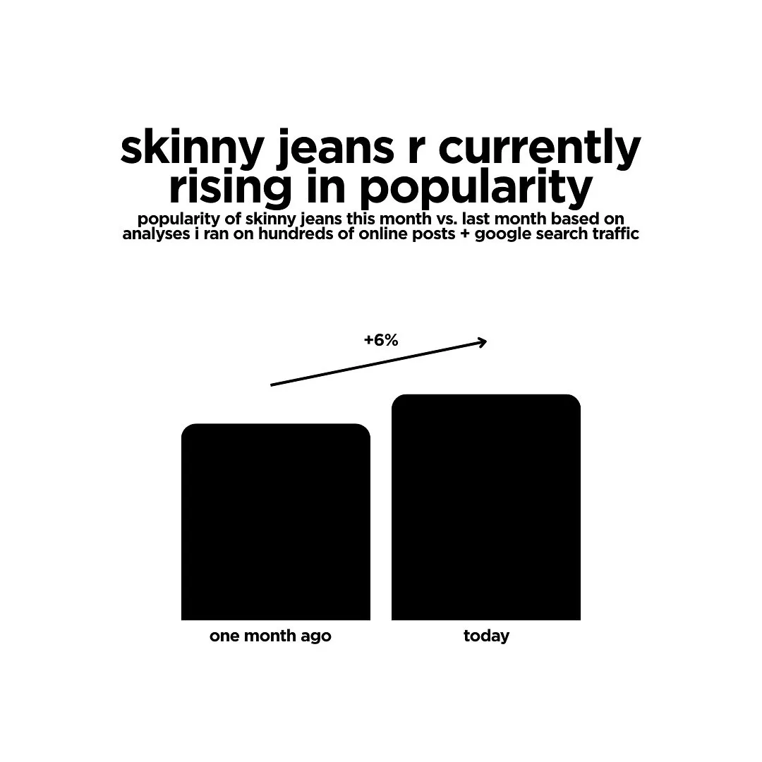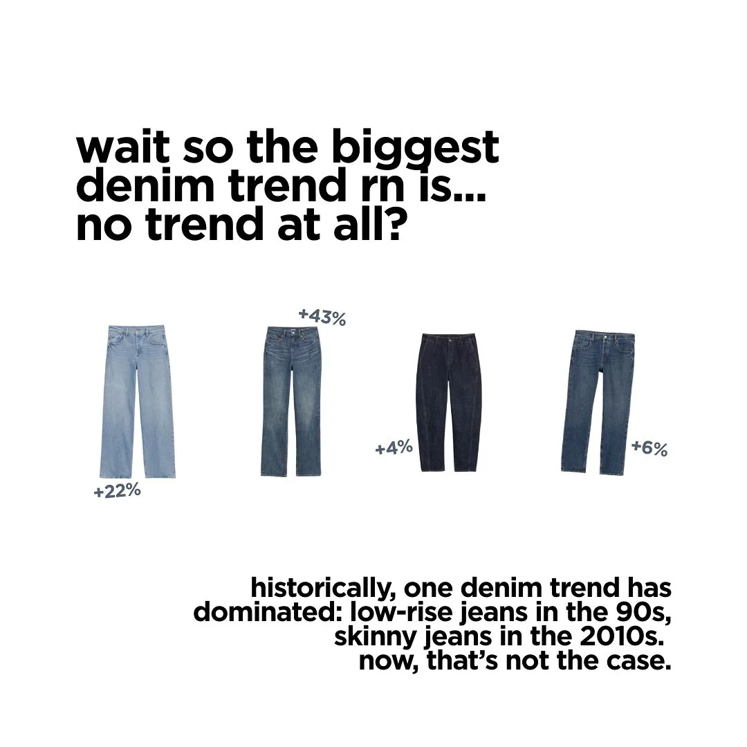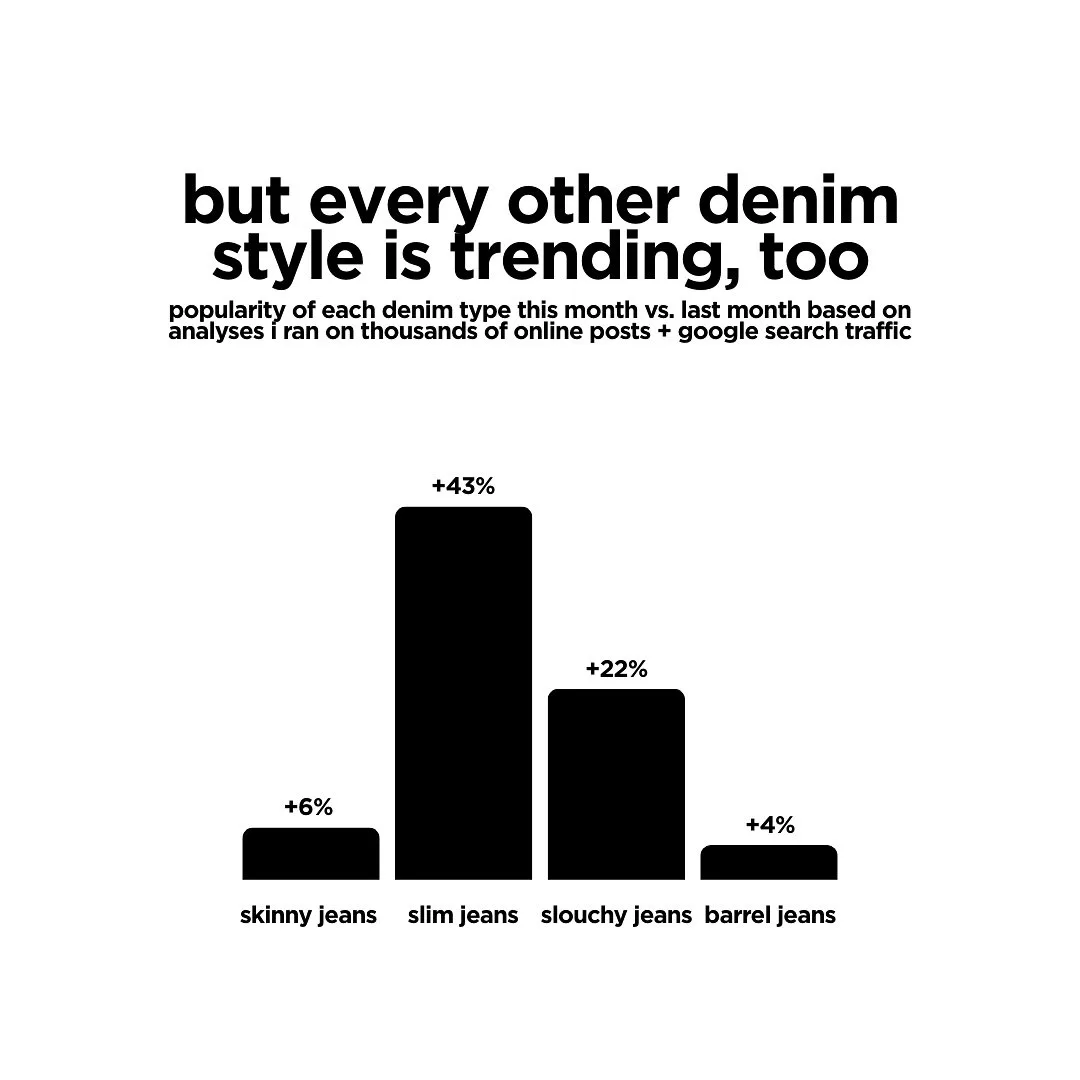Data but make it fashion рапортует: джинсовая демократия достигла апогея. После анализа тысяч постов, упоминаний и поисковых запросов выяснилось: все типы денима растут в популярности одновременно — от skinny до slouchy и barrel.