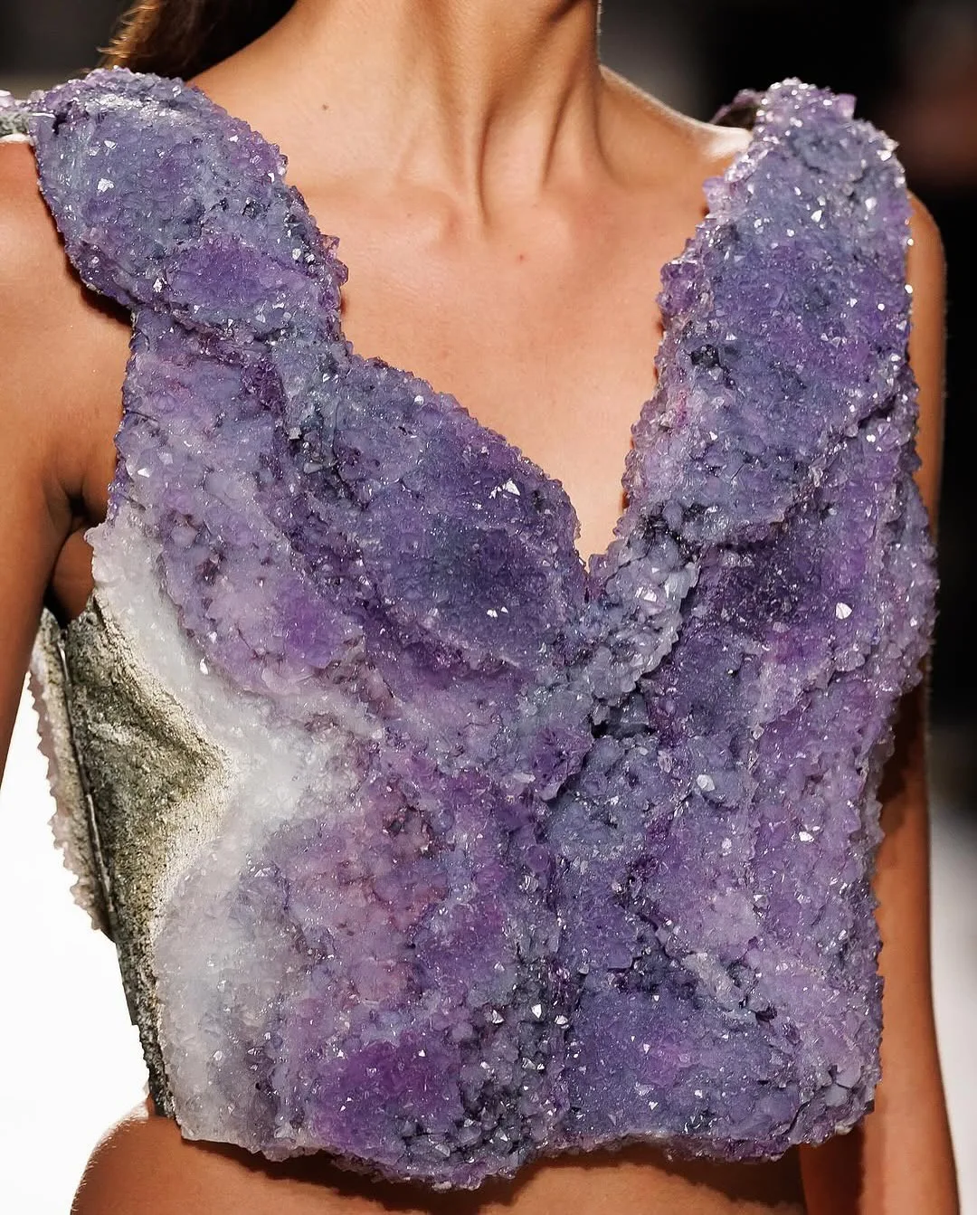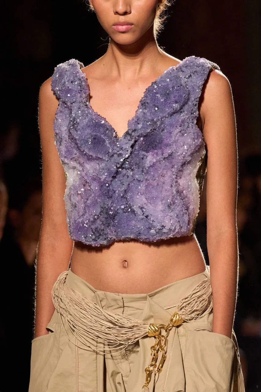 Оливье Рустен потратил больше шести недель, чтобы собрать этот бюстье из аметиста для коллекции Balmain SS 26: часть его была напечатана на 3D-принтере, часть — вручную окрашена и огранена.