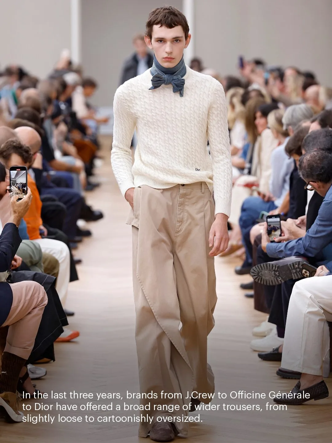 Сейчас же бренды от J.Crew до Dior возвращают объём — от умеренно свободных до почти карикатурных пропорций. Широкие брюки работают не только как тренд, но и как инструмент: они позволяют экспериментировать и выстраивать личный стиль вокруг силуэта. В соцсетях даже появились мемы, на которых сравнивают привлекательность мужчин в свободных брюках и узких. И первые всегда выигрывают.