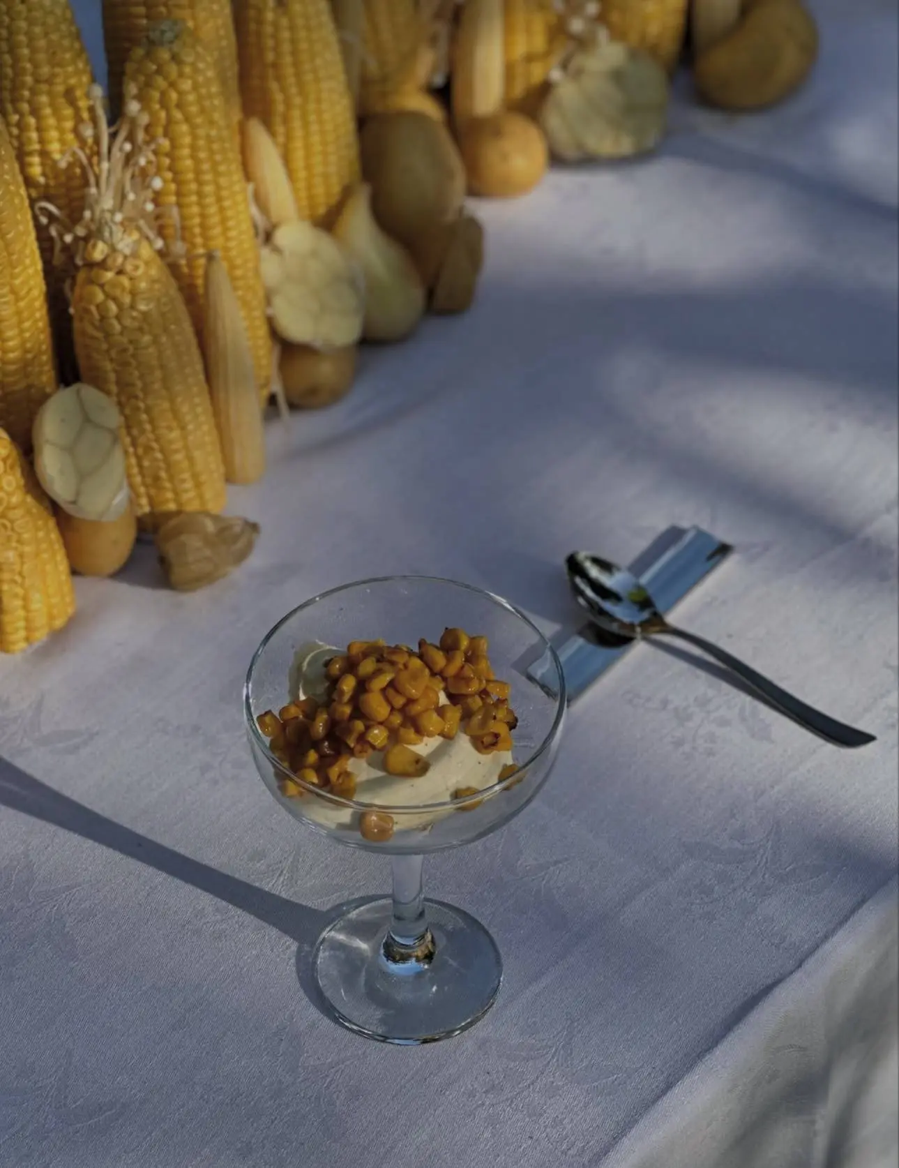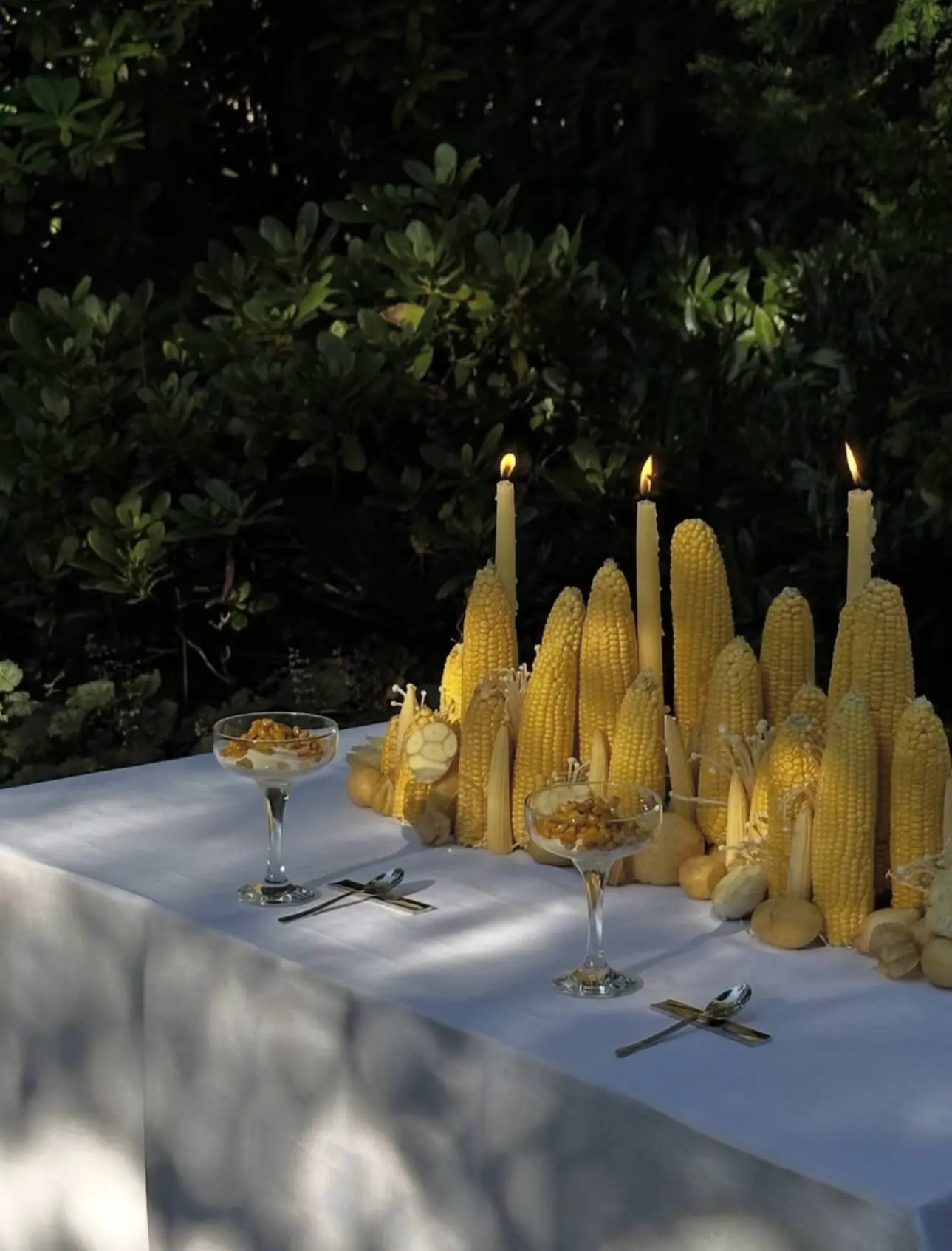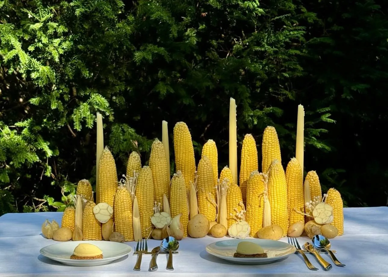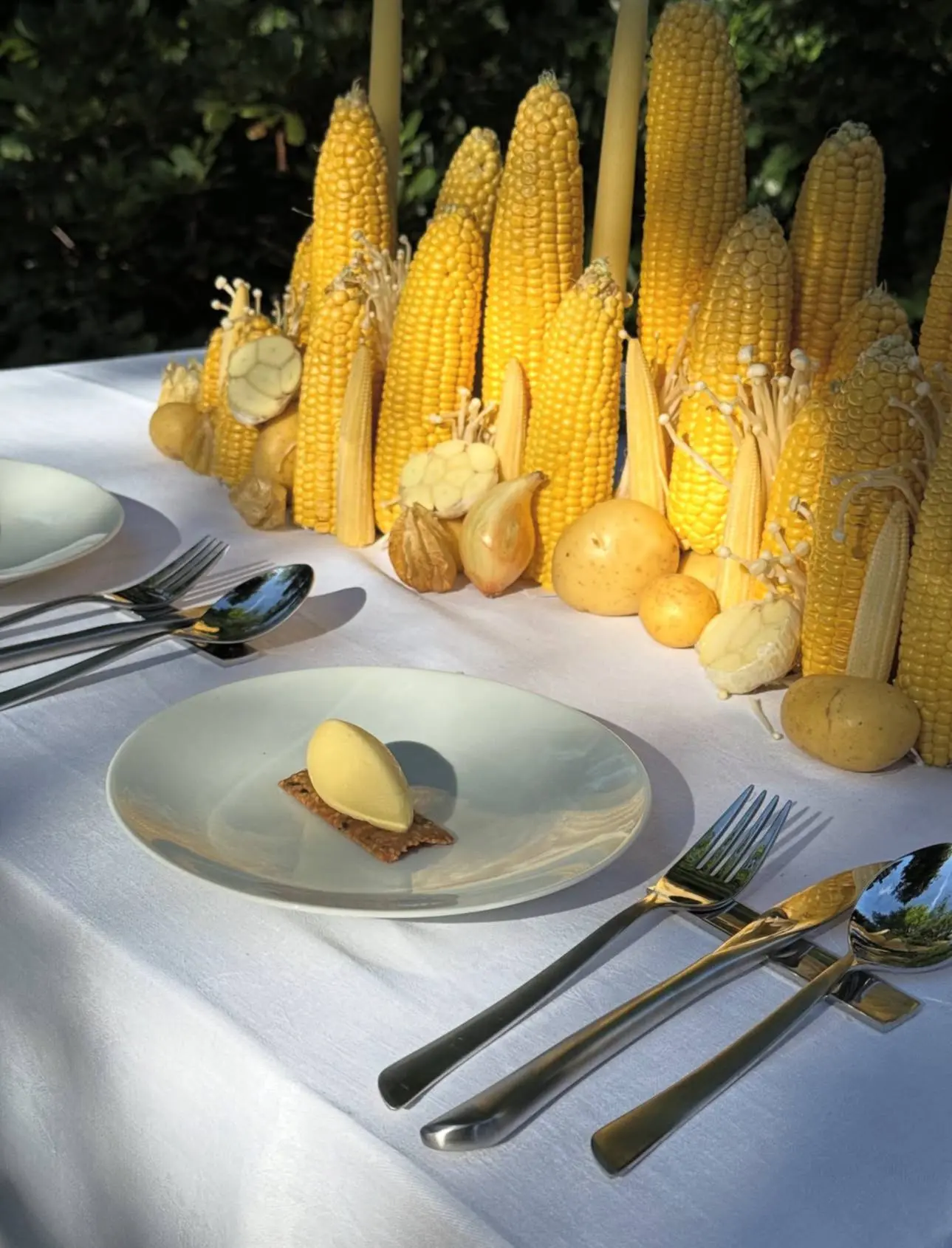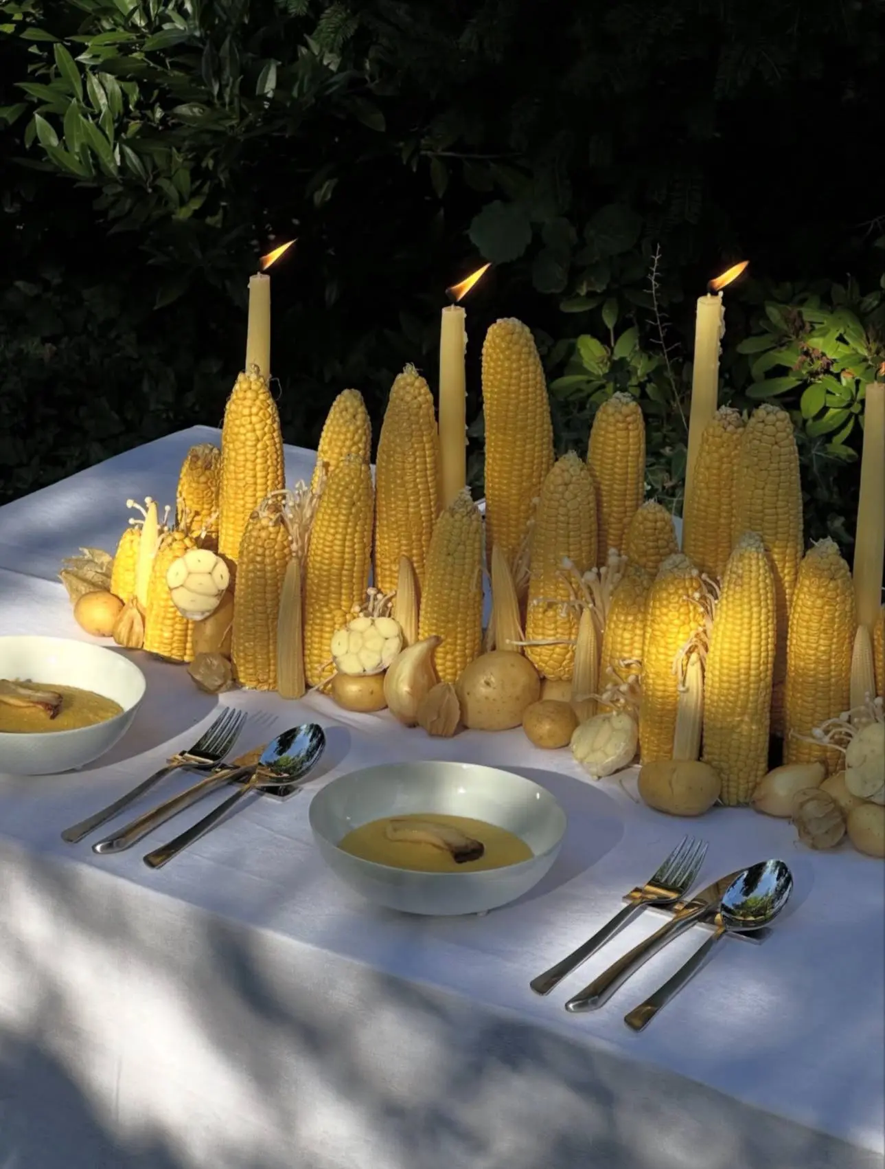 Пример того, как сервировка может говорить теми же смыслами, что и само блюдо. Композиция из кукурузы, картофеля, чеснока и свечей стала продолжением меню: полента с грибами, чесночное масло и ванильное мороженое с жареной кукурузой и морской солью. Забираем в копилку необычных фуд-идей!