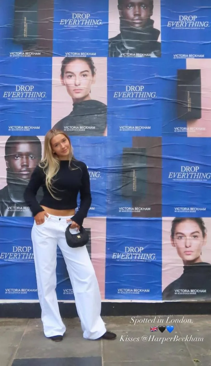 Ничего более классического, чем сочетание чёрного с белым, придумать невозможно. Поэтому #лукдня — Харпер Бекхэм в Лондоне на фоне рекламы косметического бренда её мамы.