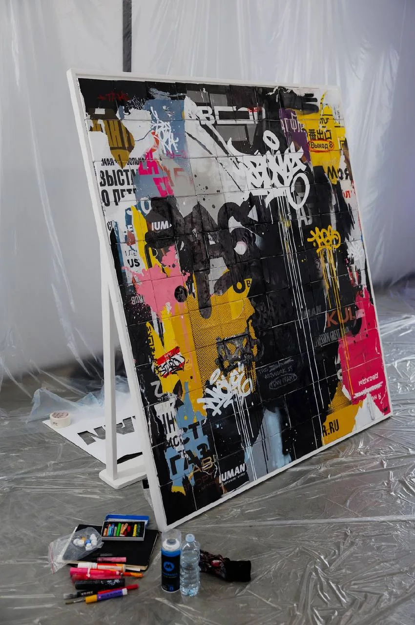 Художник и резидент Bad Gallery Евгений Старов специально создал работу из более чем ста маленьких холстов, складывающихся в единую картину. Позже гости вечера смогли забрать себе фрагменты полотна как личный арт-объект и символ новой главы бренда.