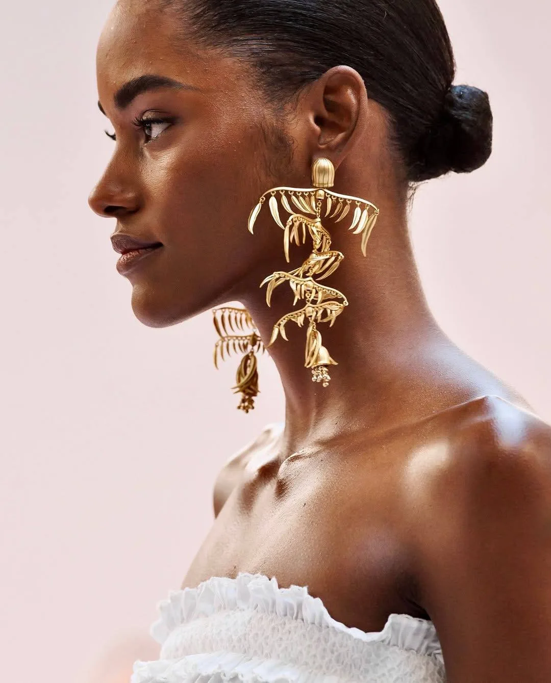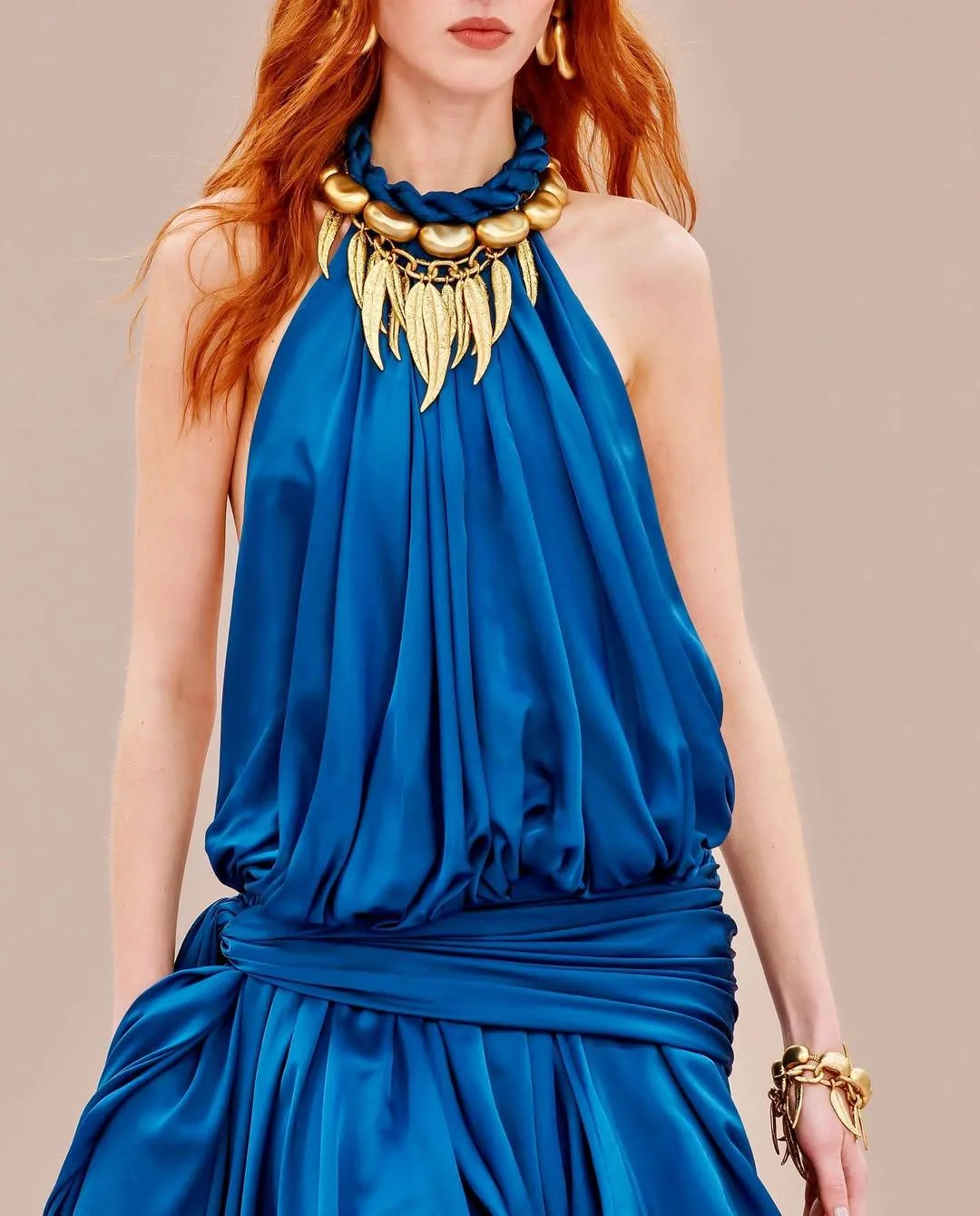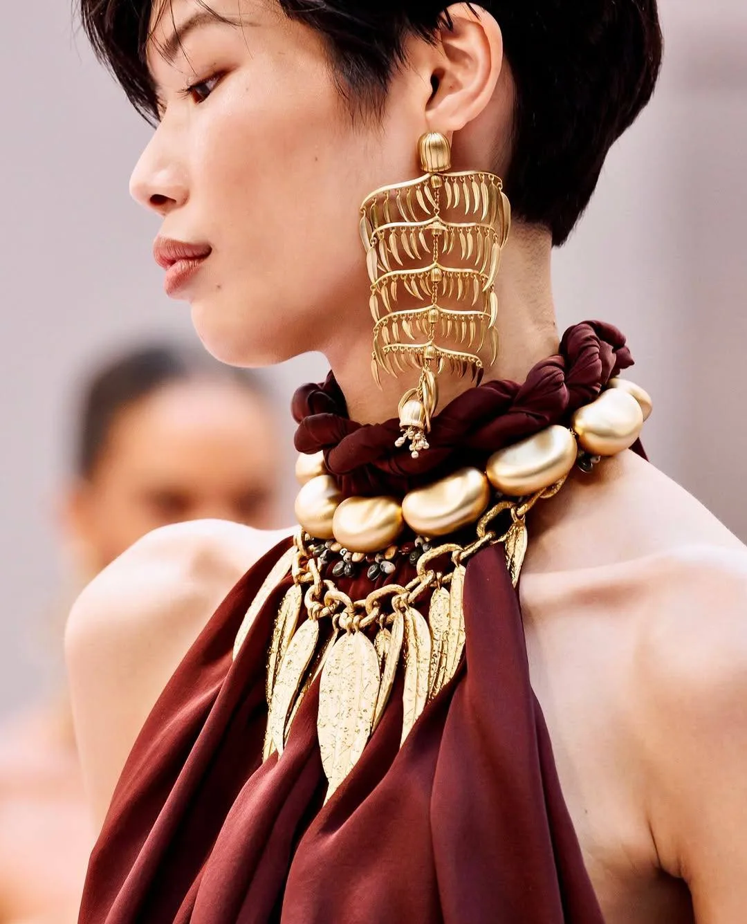 В коллекции SS 26 крупные золотые формы — будто фасолины и листья — задали образам скульптурный ритм.