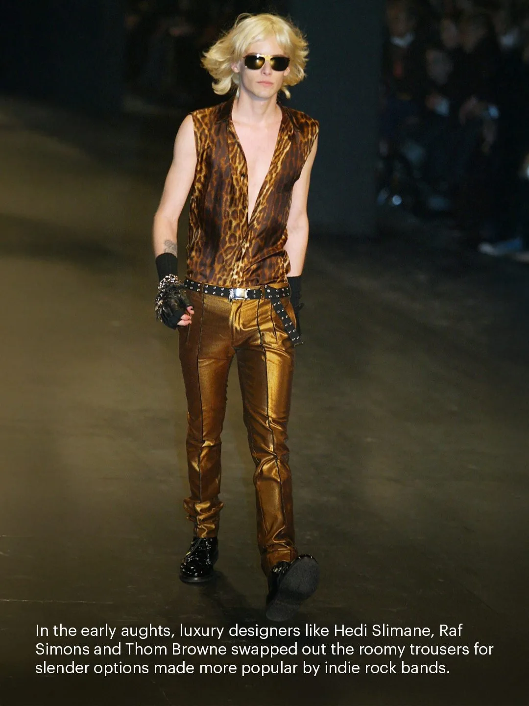 История цикла проста: в 1980–90-е Армани строил элегантность на просторных линиях, в нулевых Эди Слиман и направление Indie Sleaze сделали ставку на узкие фасоны, а к концу 2010-х слим стал повседневной униформой.