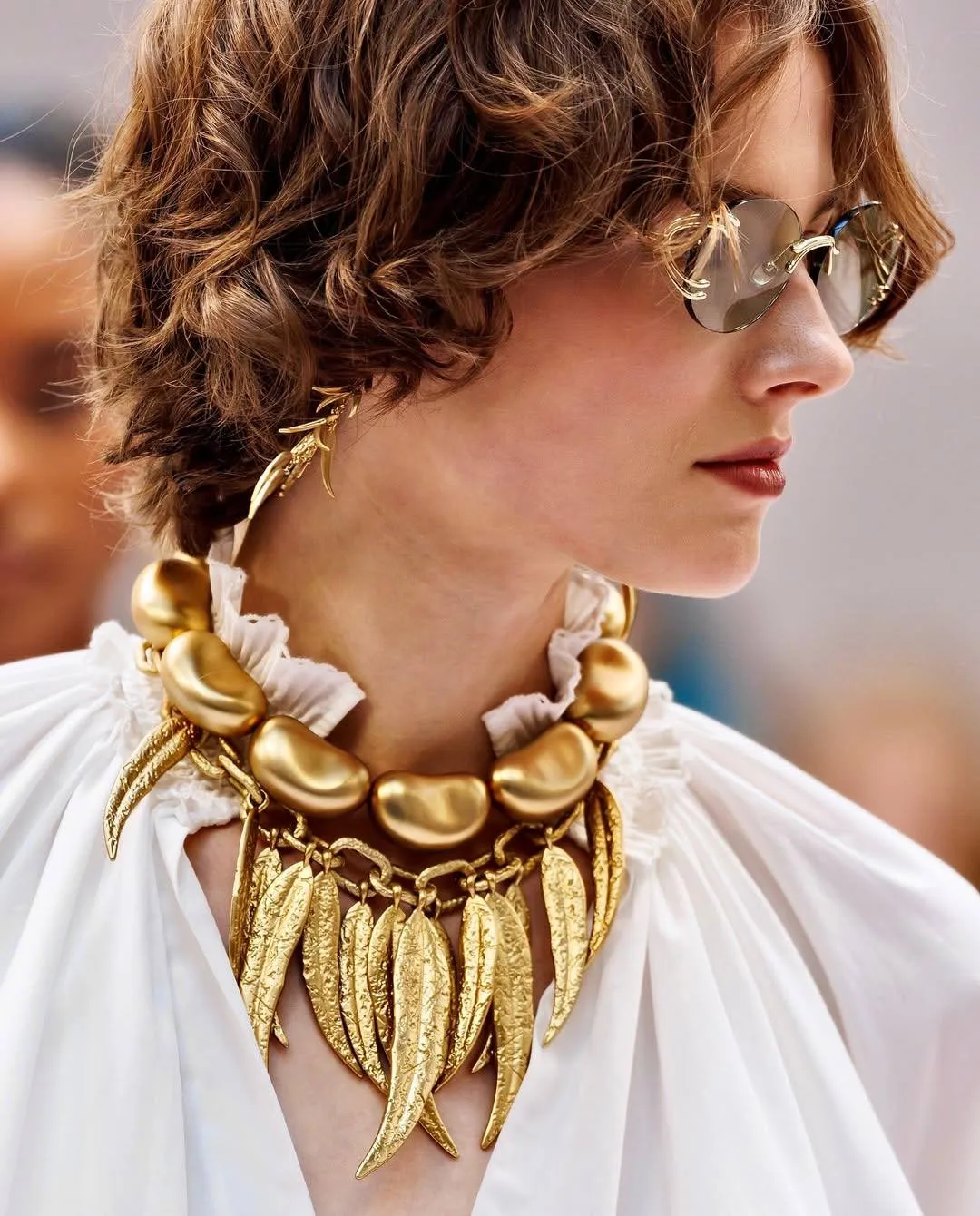 Берем на заметку: массивные украшения лучше всего работают в паре с простыми тканями — шелком, денимом, хлопком — и ненамеренно становятся визуальным центром, удерживающим даже самый обычный силуэт.