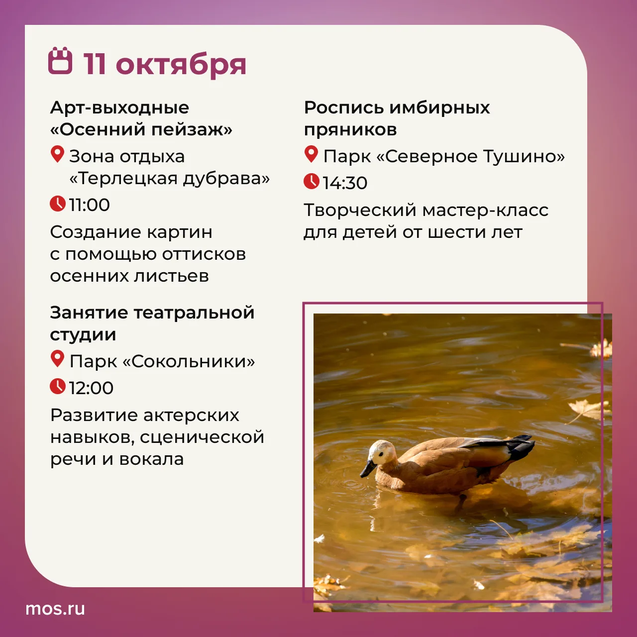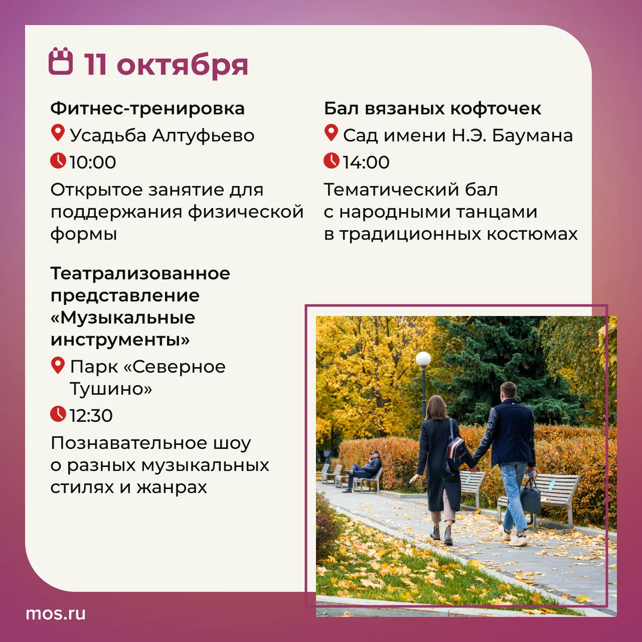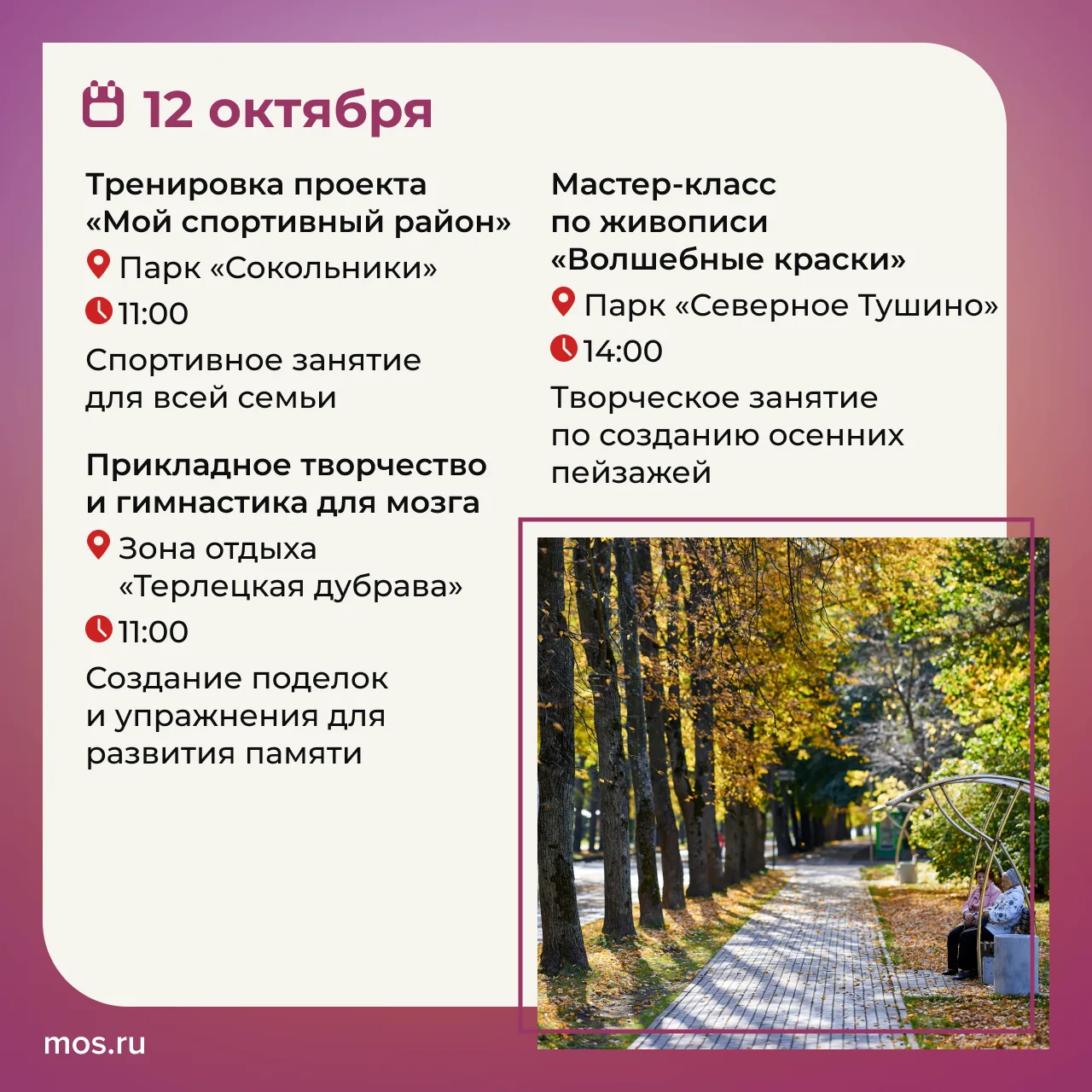 🍁 Столичные парки приглашают активно провести эти выходные. Бесплатные тренировки, творческие мастер-классы, танцы и экологические прогулки — каждый найдет занятие по душе. Подробности собрали в карточках.