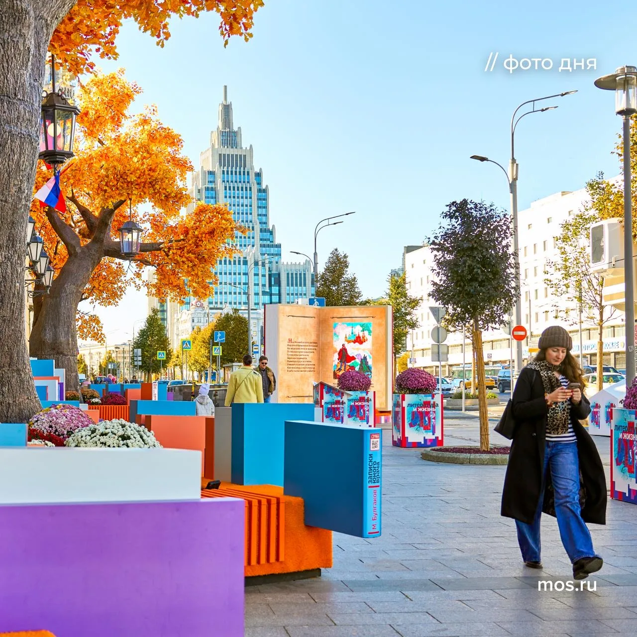 📚 Загляните в литературное пространство на Садовой-Самотечной улице. Здесь установили огненно-рыжие деревья, необычные скамейки, а еще трехметровую книгу.