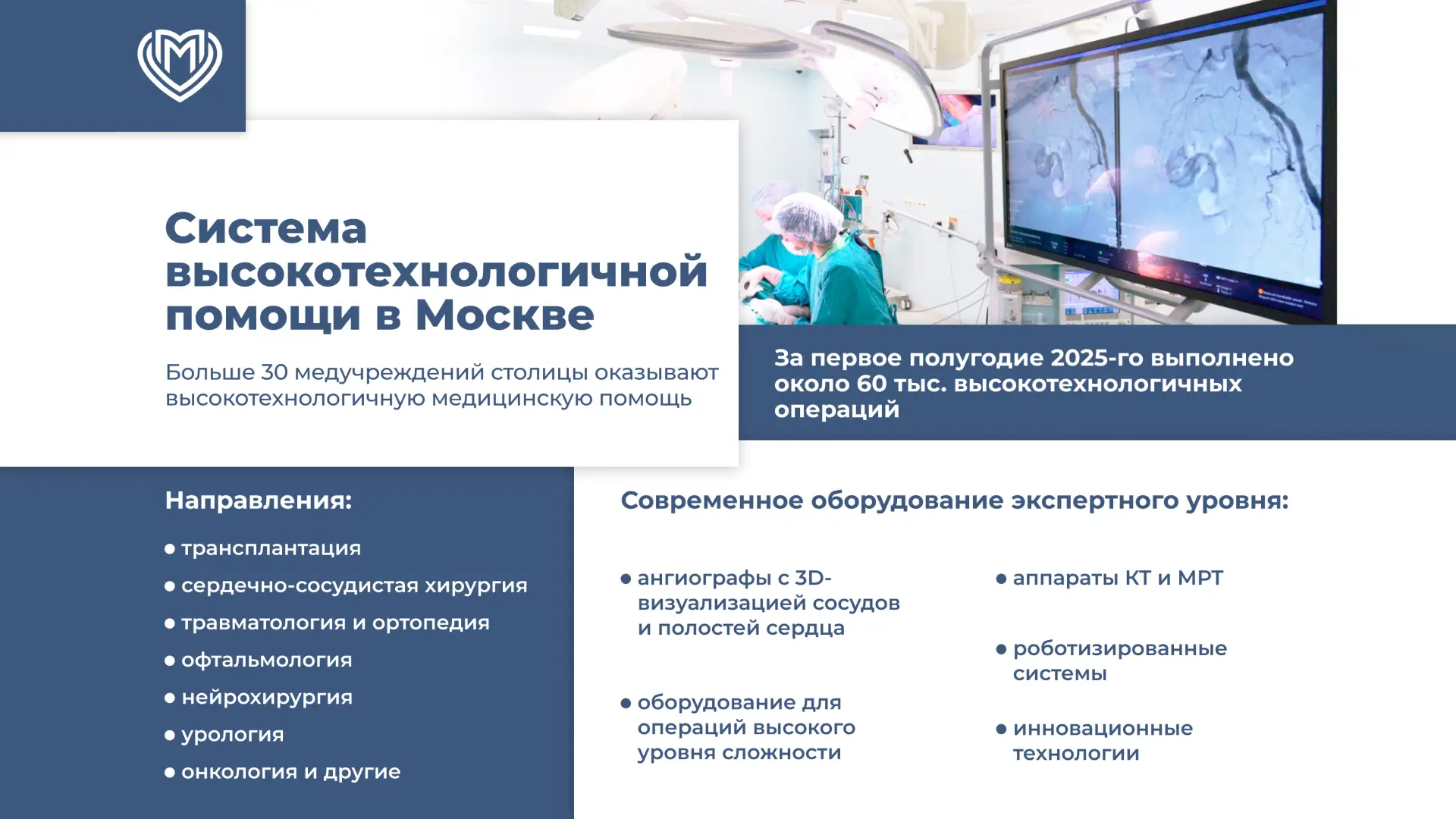 Сегодня в столице такую помощь оказывают свыше 30 городских медучреждений. Только за первое полугодие 2025-го в них выполнено почти 60 тыс. высокотехнологичных операций — это почти в 2 раза больше, чем за аналогичный период пять лет назад.