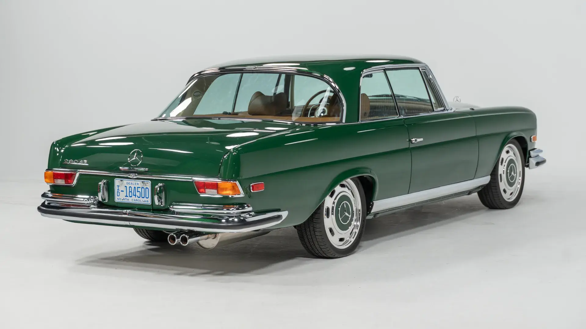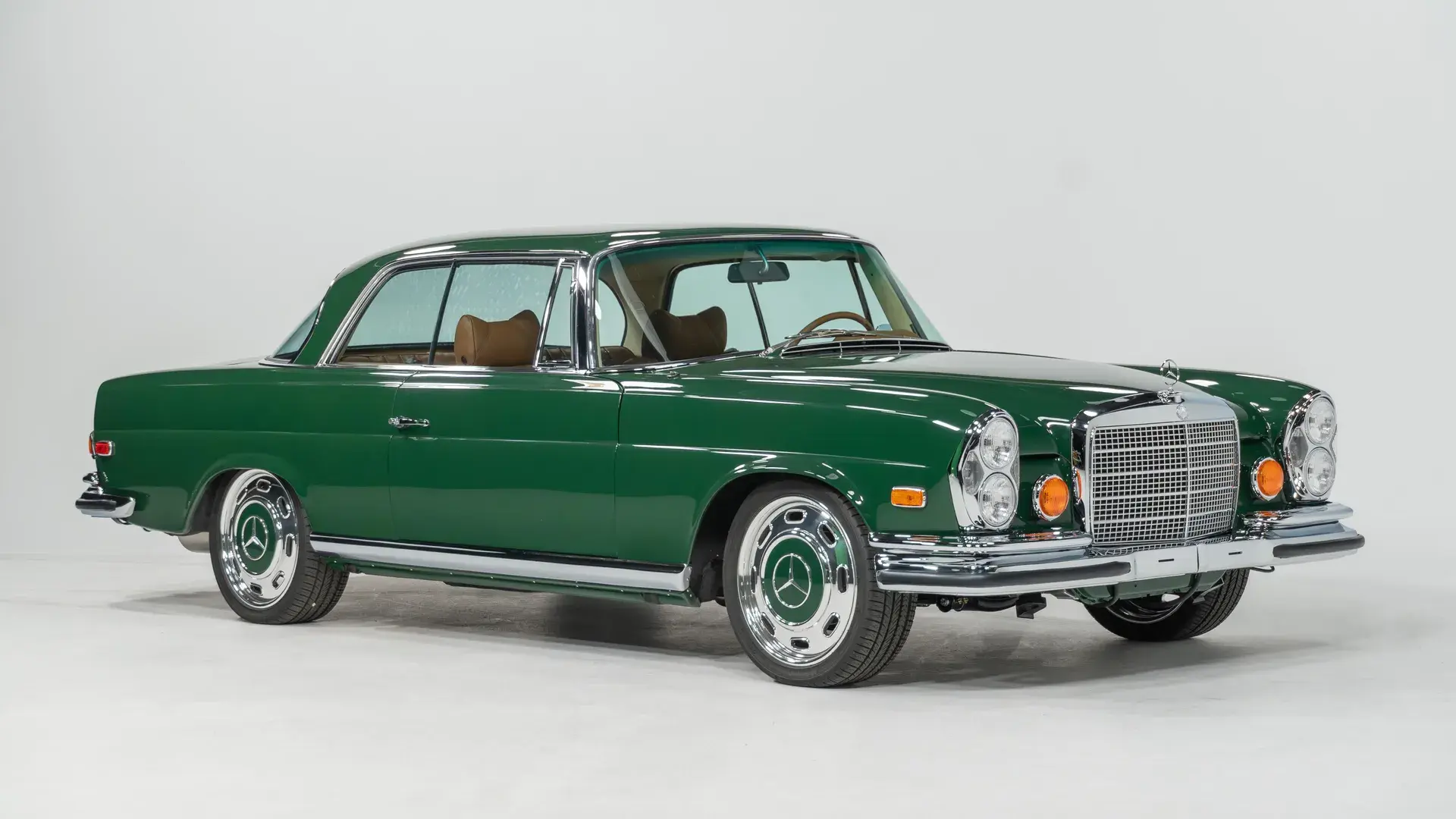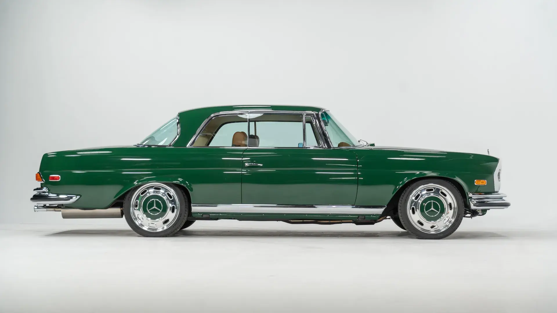 Снаружи — классический облик W111, зелёный кузов, диски Bullet, хромированные детали и полировка до зеркального блеска.