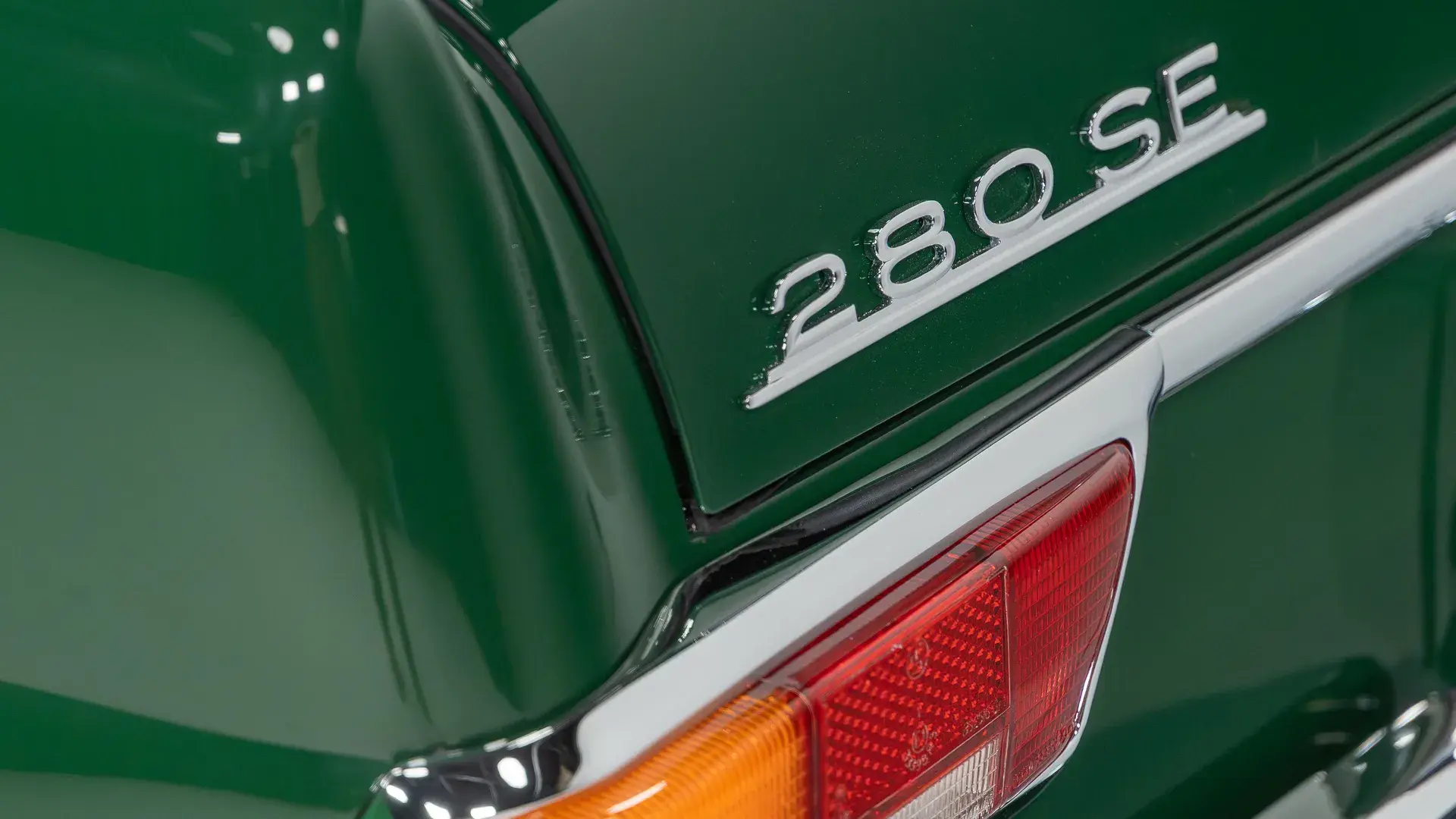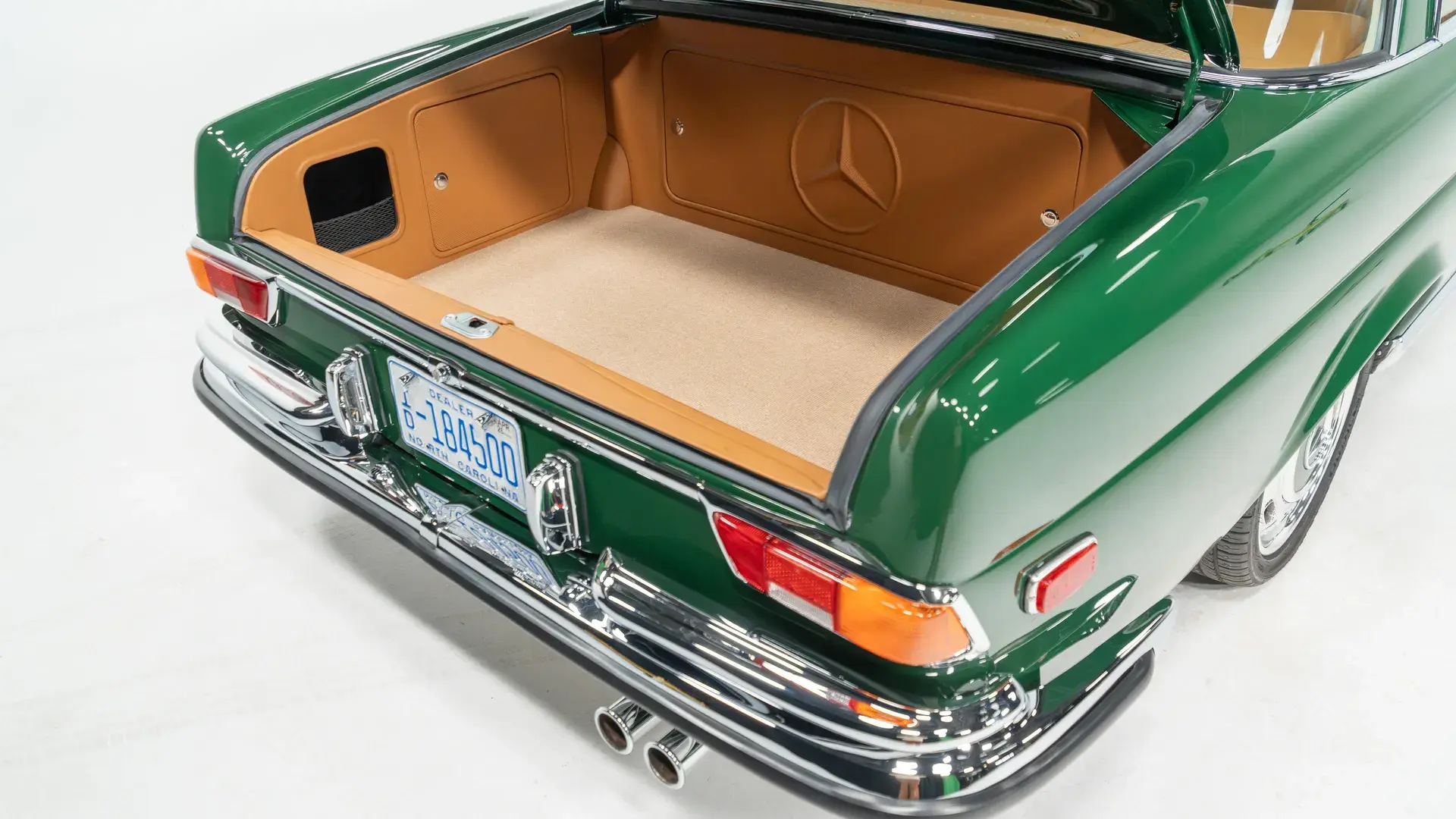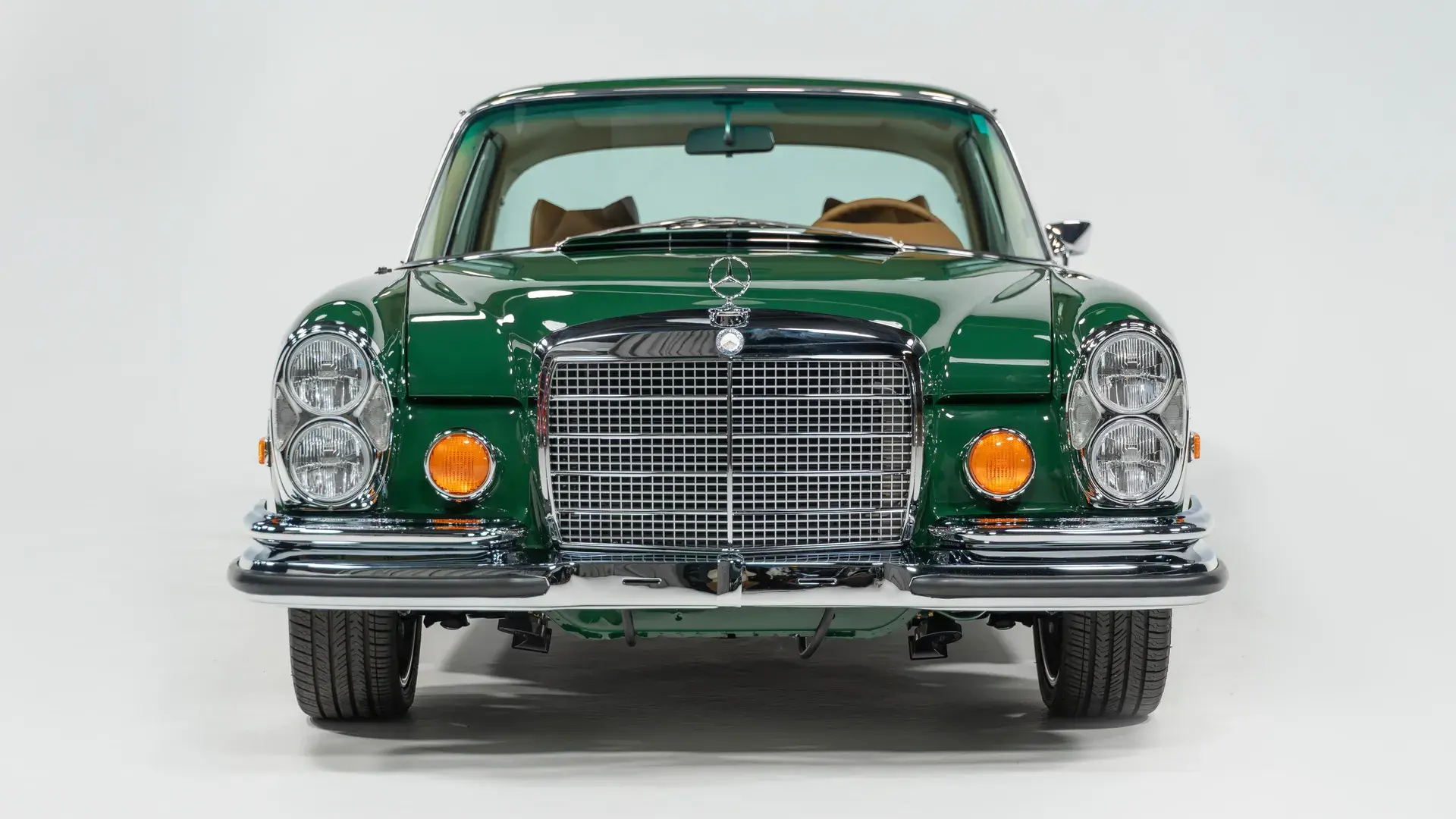 Снаружи — классический облик W111, зелёный кузов, диски Bullet, хромированные детали и полировка до зеркального блеска.