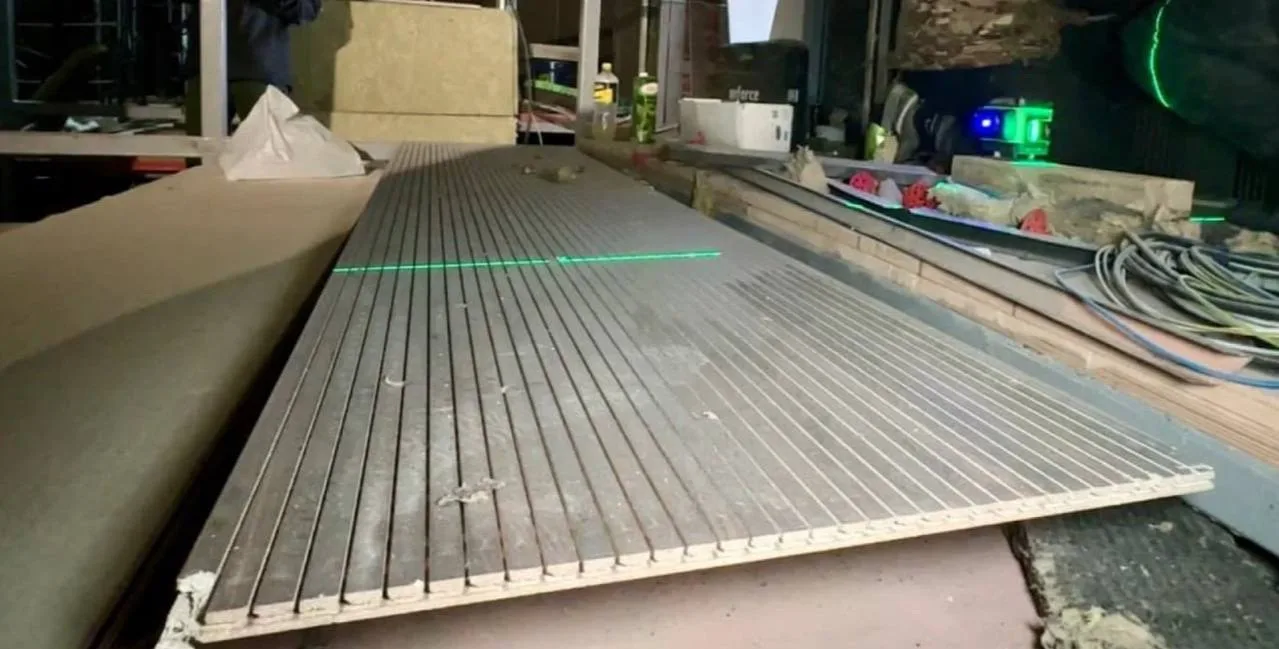 Югорские строители уже закрыли 70 % площади специальными акустическими панелями — они безопасны и улучшают звук. Всего предстоит облицевать 1200 кв. м. В отделке используют контраст белого и дерева, чтобы визуально расширить пространство.