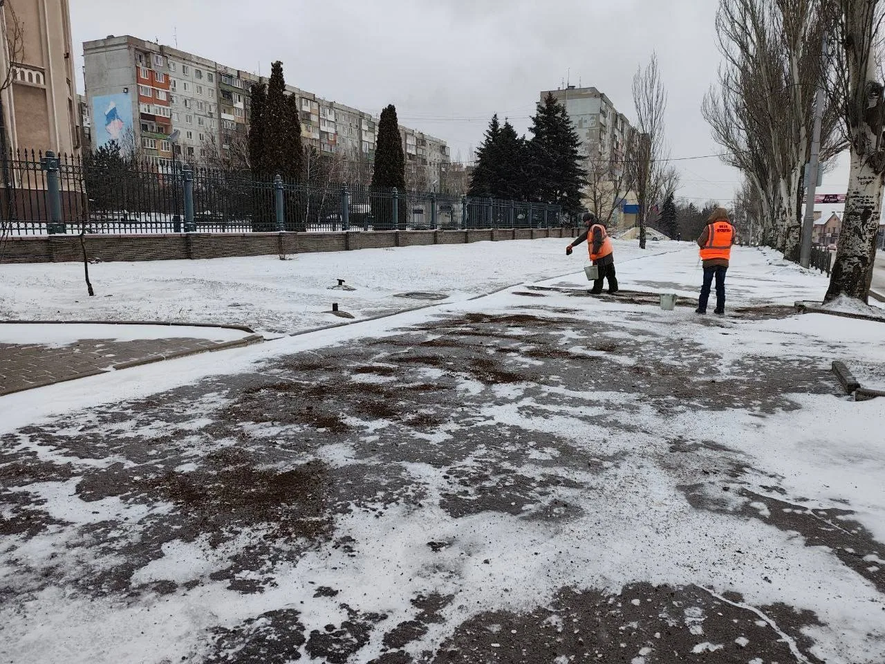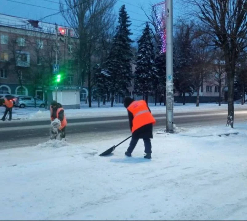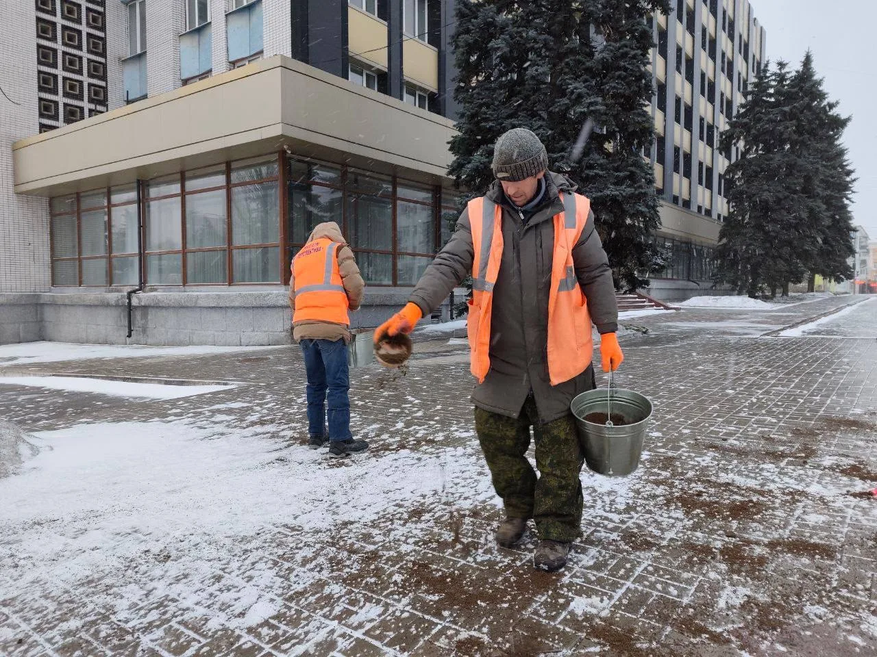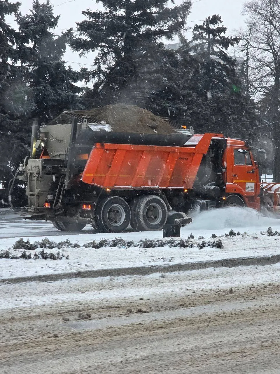 Коммунальщики убирают снег и посыпают улицы города🫡