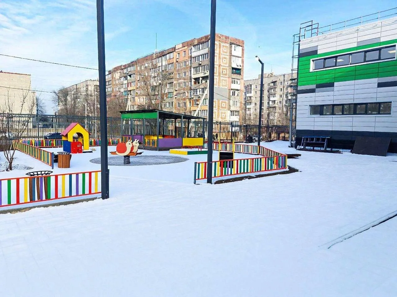 На территории садика сделали различные игровые локации: мини-футбольное поле, комплексы для скалолазания и канат. Также установили специальное оборудование для развития ловкости и моторики.