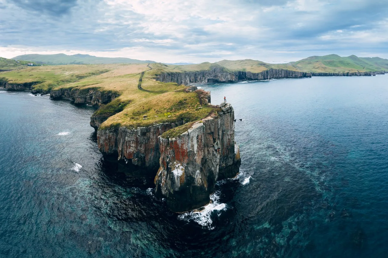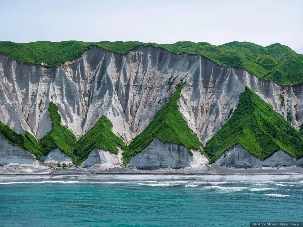 За тысячи лет на скалах появился слой зелёной травы, к подножию подступает серый, местами даже чёрный песок, а омывают побережье лазурные воды Охотского моря.