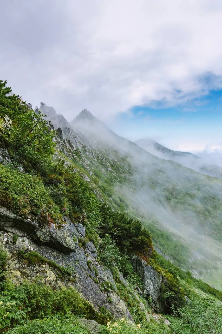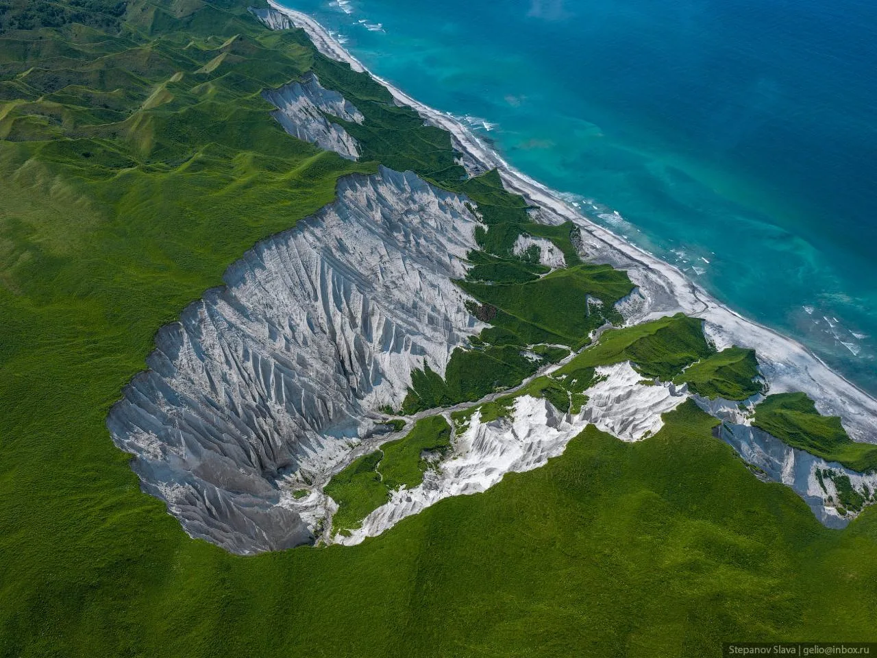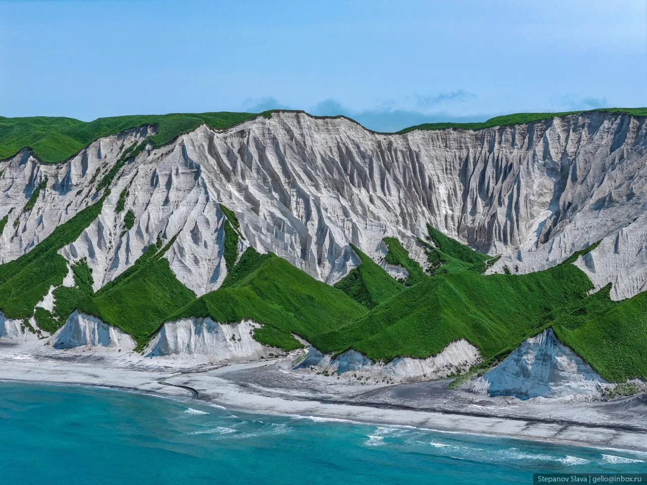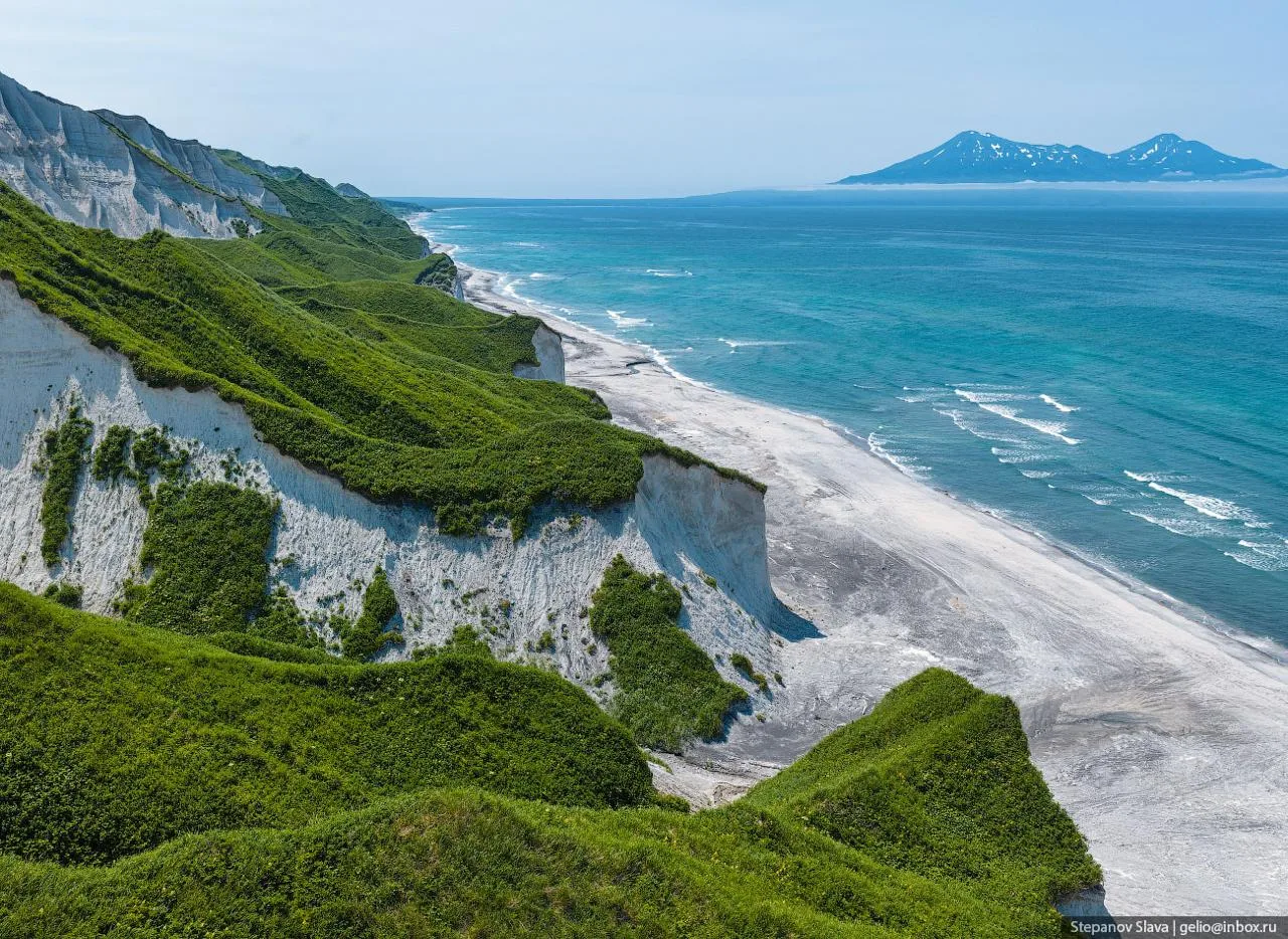 Конечно, говоря про самый большой остров Курил, сразу вспоминаешь Белые скалы. Склоны у этих гор действительно белые, особенно в солнечную погоду.