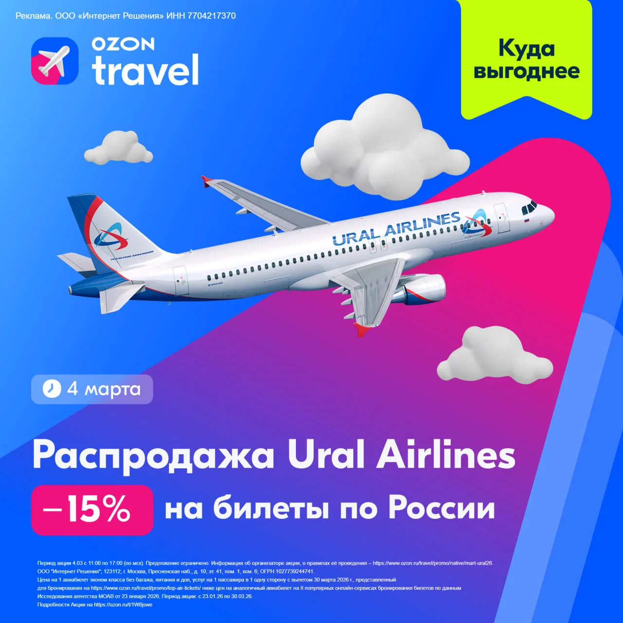 Скидка 15% на перелёты по России от Ural Airlines. Сэкономьте до 2 000 ₽