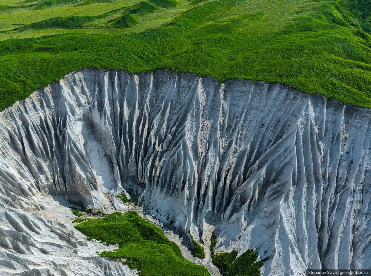 Материал мягкий, легко крошится, поэтому со временем скалы приобрели причудливую складчатую форму. Из-за пористости поверхность меняет цвет в зависимости от погоды: в солнечные дни склоны скал белоснежные, в дождливые становятся серыми.