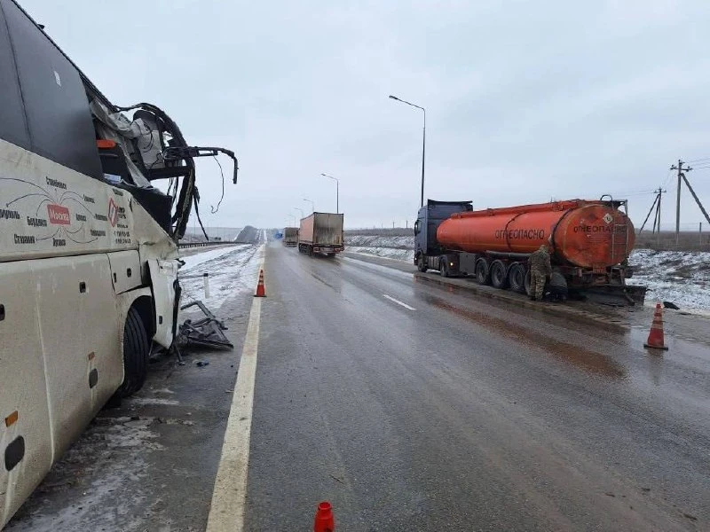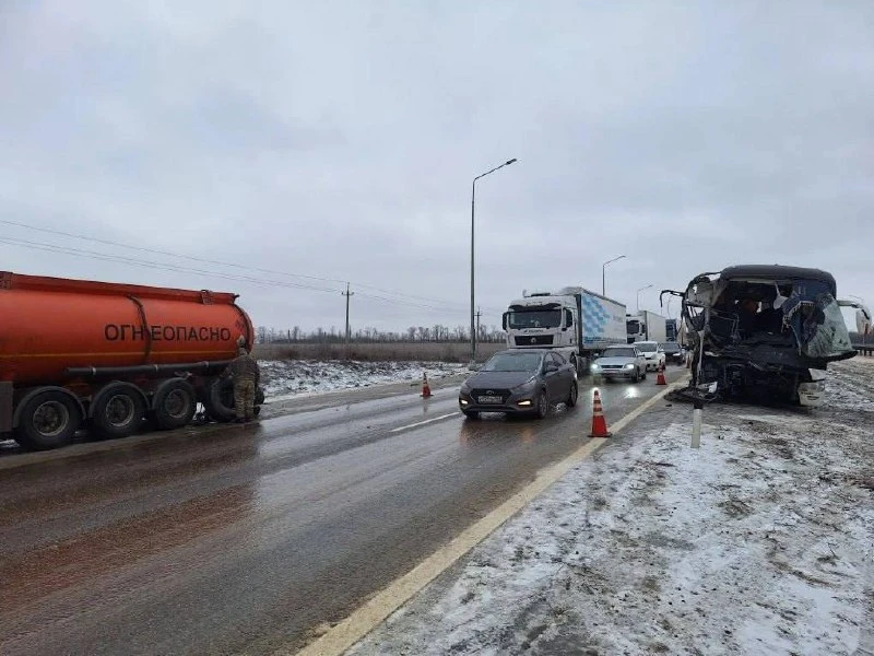 Автобус с пассажирами столкнулся с бензовозом на трассе М-4 в Миллеровском районе сегодня утром.
