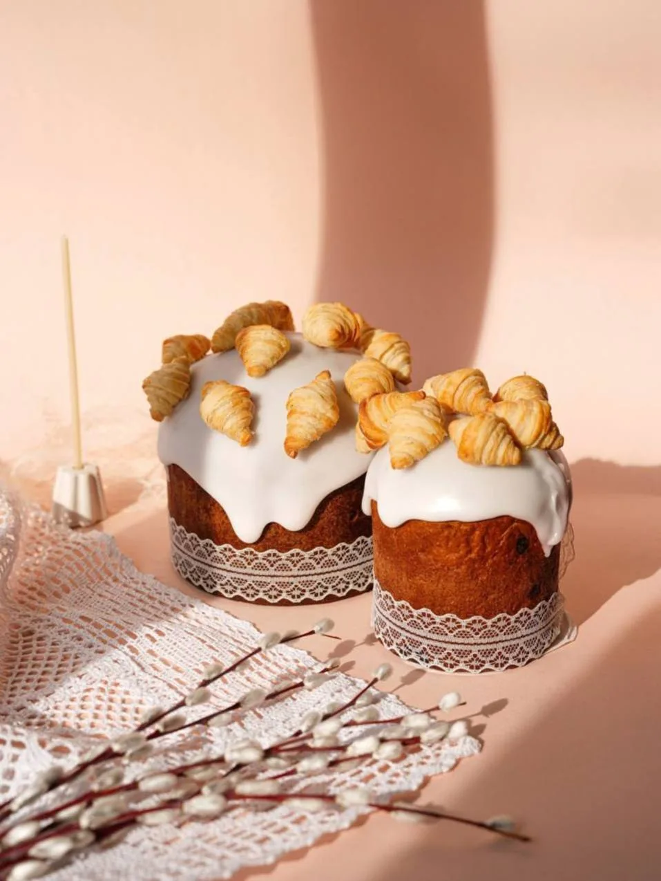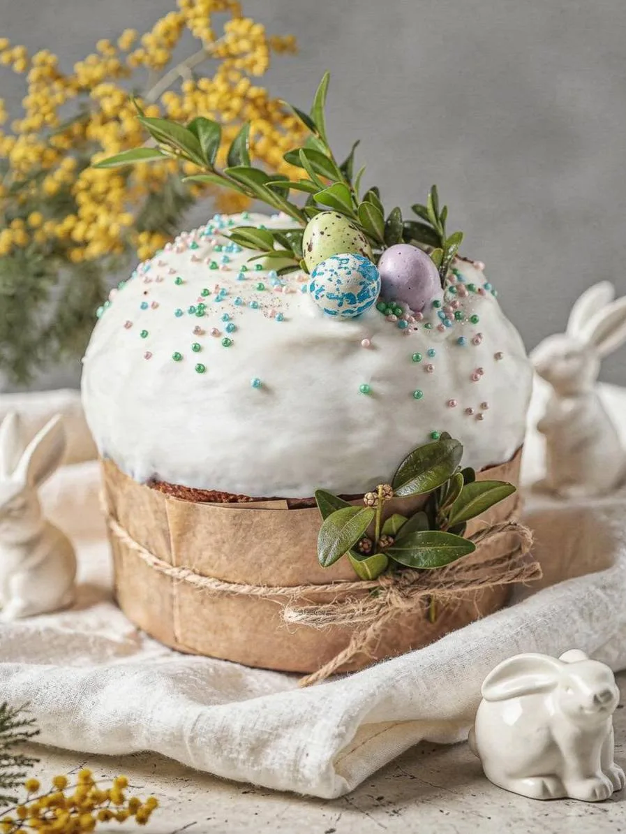 Насыщенное сдобное тесто с изюмом, шапкой из сахарной глазури, разноцветным бисером, веточкой эвкалипта и пасхальными яйцами.
