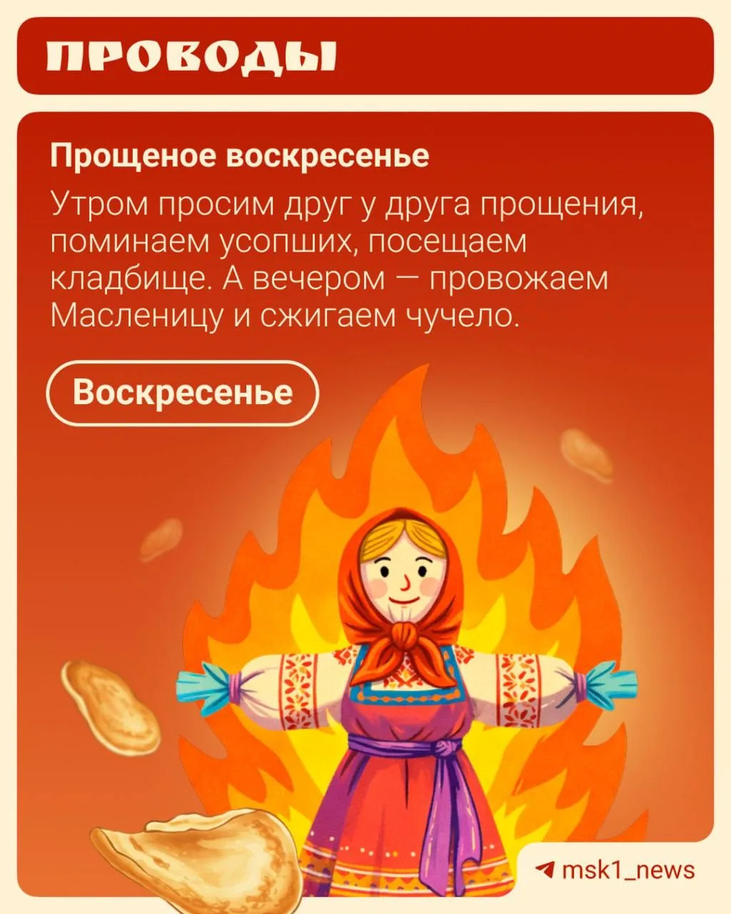 В последний день Масленицы не забудьте попросить прощения у близких и помянуть усопших, а вечером — проводить зиму.