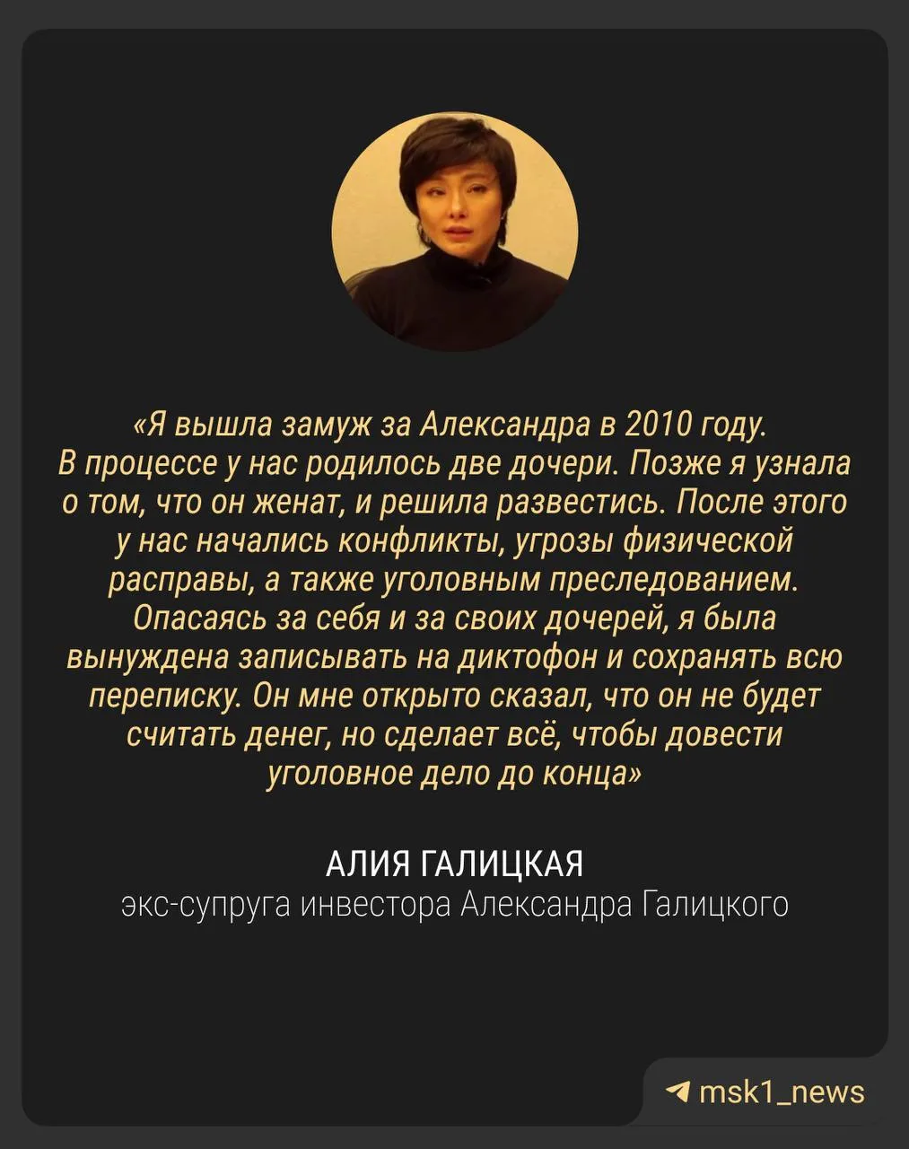 Алия покончила собой в ИВС Истры — ее арестовали за вымогательство у экс-супруга бизнесмена Александра Галицкого 150 миллионов долларов. Позже Мособлсуд признал арест незаконным.
