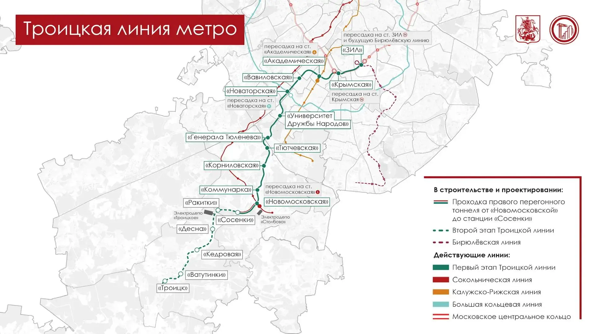Откроется шесть станций: «Сосенки», «Ракитки», «Десна», «Кедровая», «Ватутинки», «Троицк». Завершить бурение планируют в этом году.