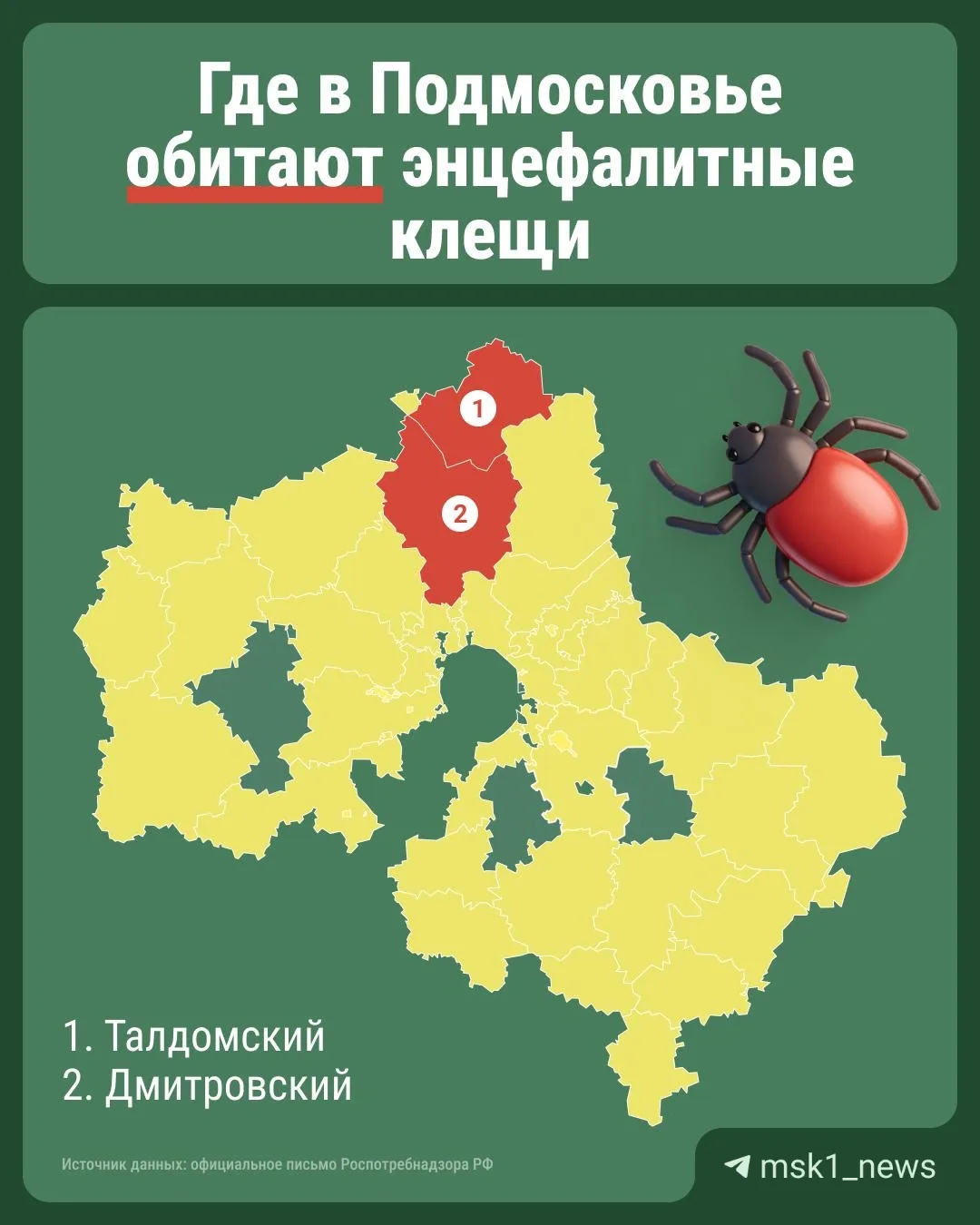 Роспотребнадзор сообщил, что во всей области больше всего энцефалитных клещей обитает в Талдомской и Дмитровской области. Но это не значит, что в других городах нельзя заболеть от их укуса.