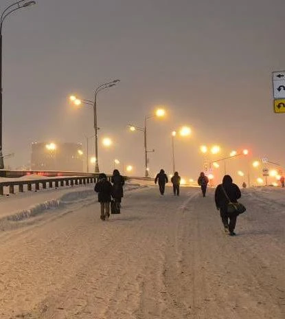 Этим утром жители Коммунарки дружной толпой шли до станции метро «Потапово». Местные жалуются, что после вчерашнего снегопада автобусы не могут доехать до конечной станции, поэтому пассажиров высаживают на дороге.