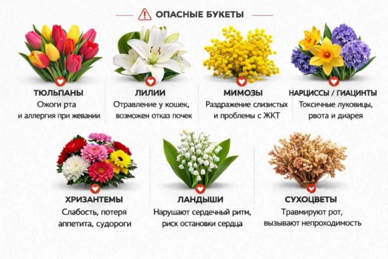Популярные на 8 Марта цветы могут спровоцировать у домашних питомцев сильную аллергическую реакцию с рвотой, ожогами слизистой, судорогами, а в тяжёлых случаях даже могут вызвать остановку сердца.