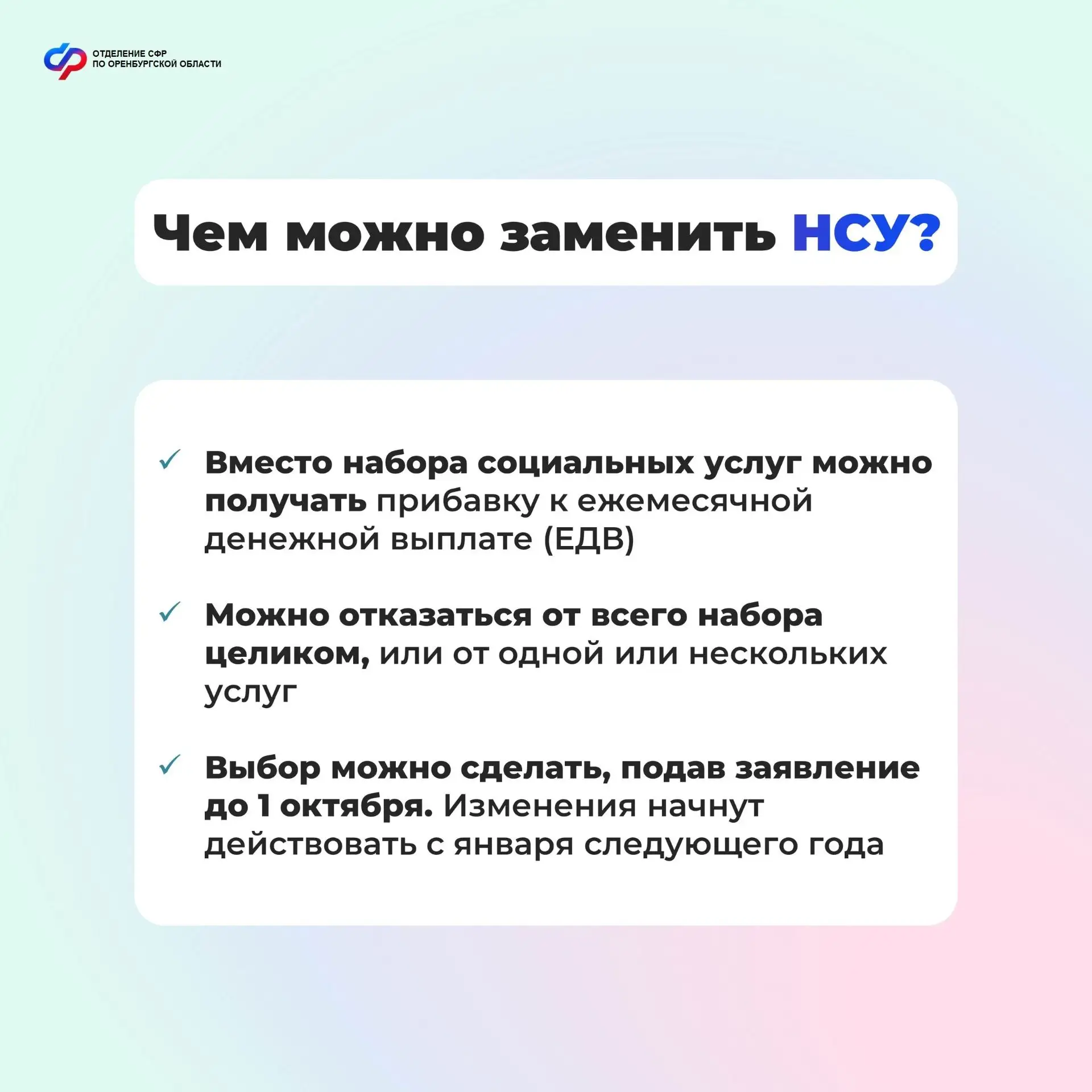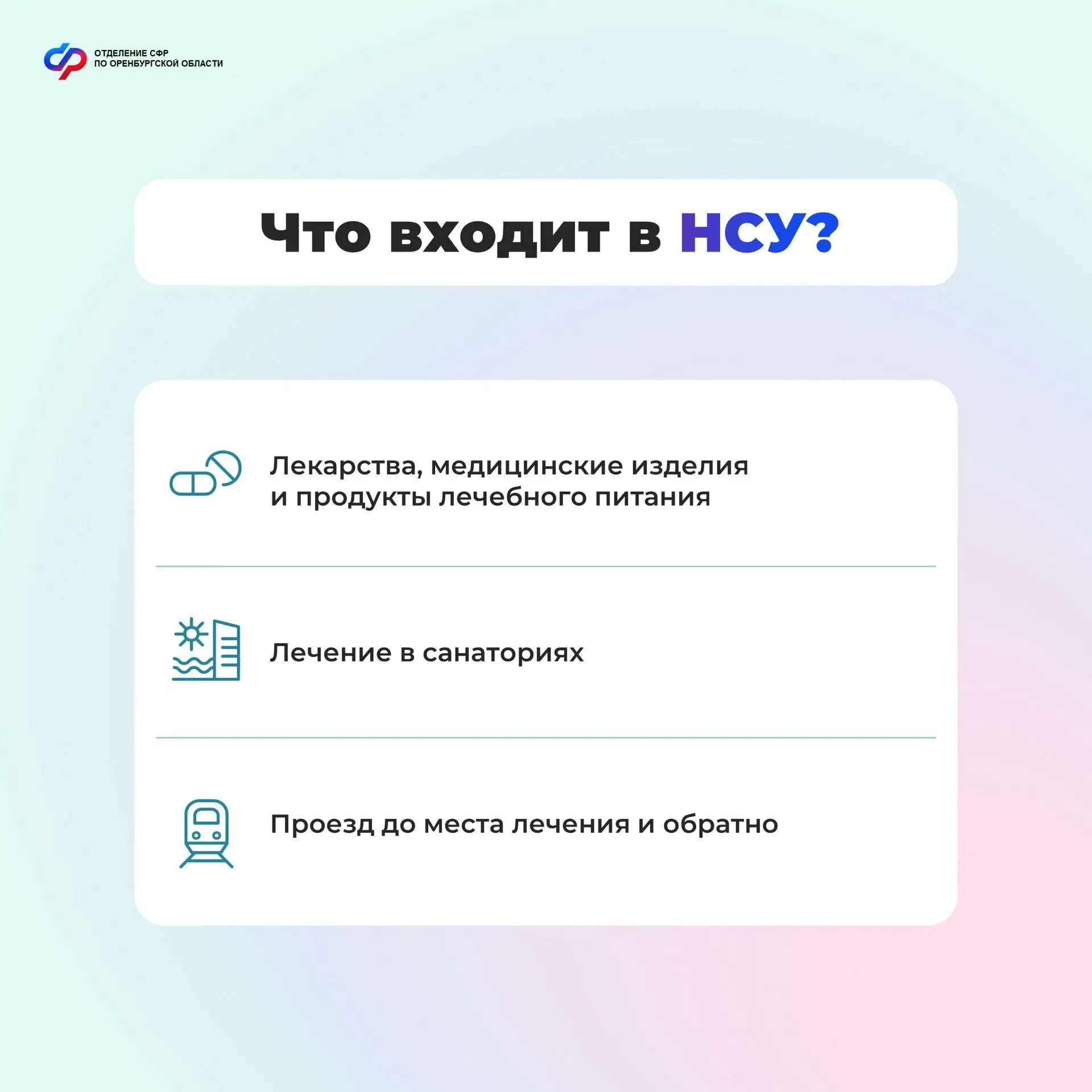✅Набор социальных услуг (НСУ) предоставляется получателям ежемесячной денежной выплаты (ЕДВ). Он включает в себя медицинскую, санаторно-курортную и транспортную составляющие.