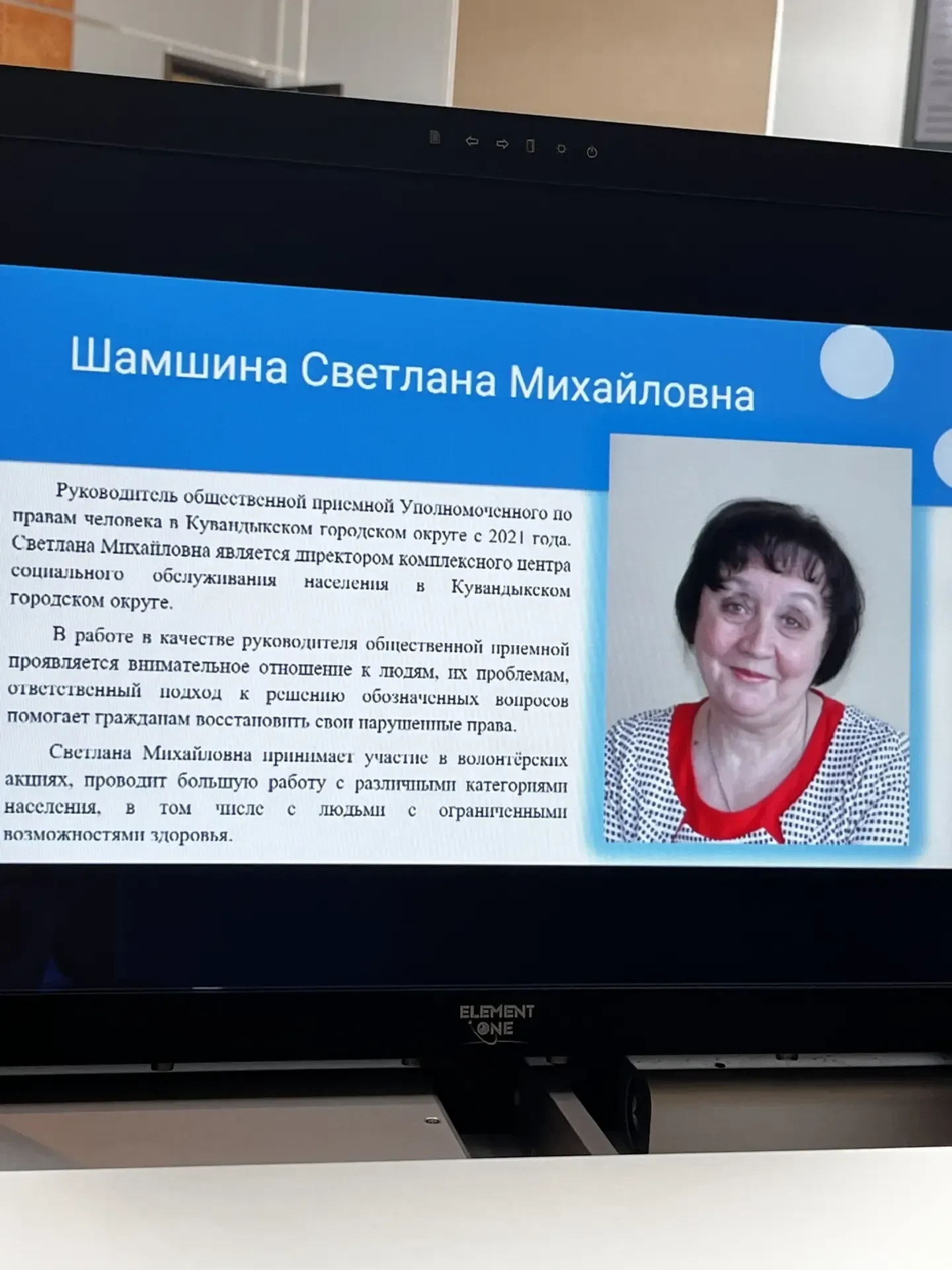 Светлана Михайловна, возглавляющая общественную приемную Уполномоченного по правам человека в Кувандыкском городском округе с 2021 года, отмечена за чуткость, серьезный подход к решению проблем и активную добровольческую деятельность, направленную на поддержку различных групп населения, включая людей с инвалидностью.