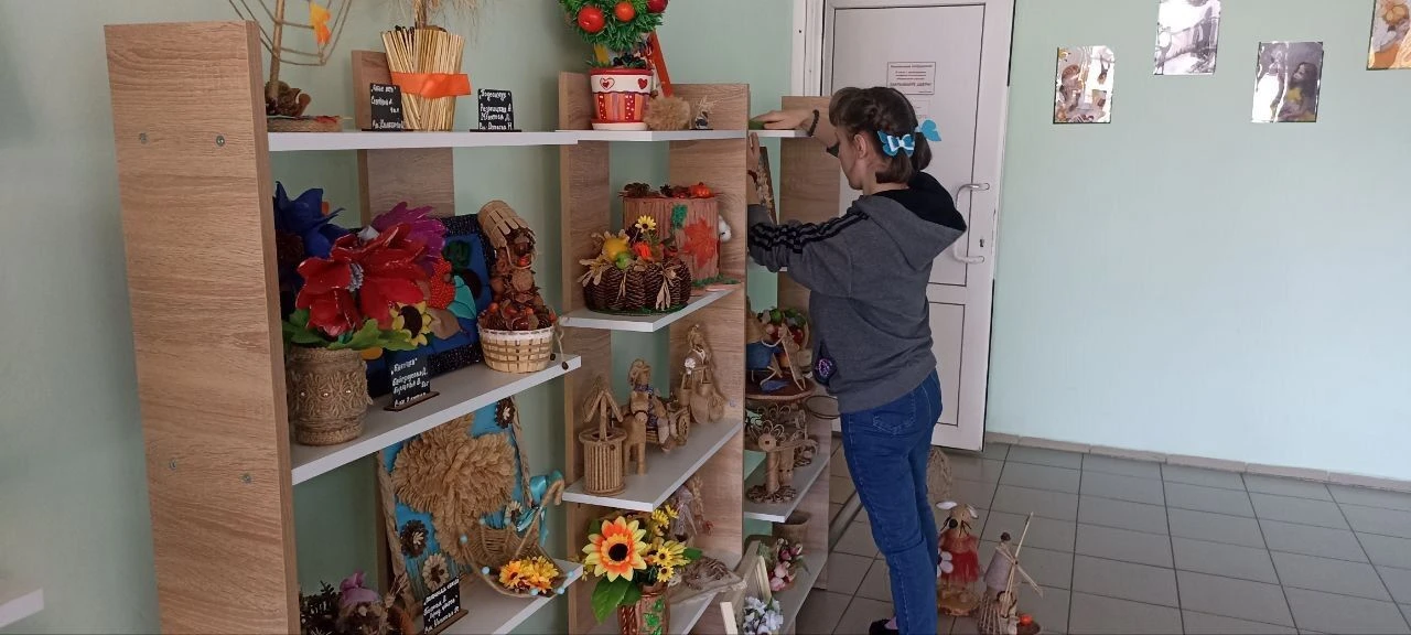 Ольга и Анна бережно ухаживают за выставочной зоной, аккуратно вытирая пыль с витрин и творческих работ, созданных руками наших воспитанников.