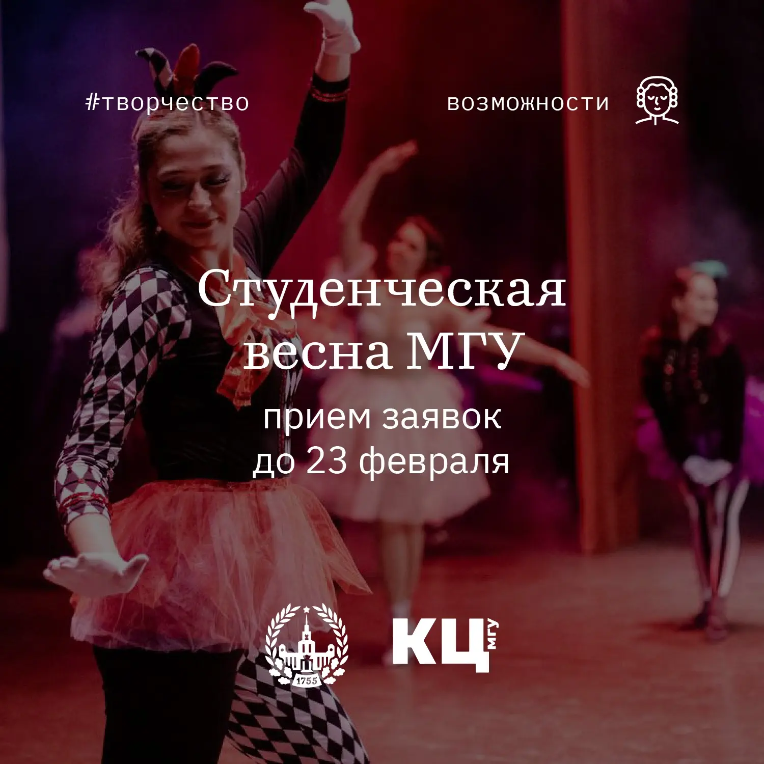 До 23 февраля открыт прием заявок на участие в Студенческой весне МГУ – официальном отборочным этапе Московской студенческой весны. Фестиваль проходит по 10 направлениям в индивидуальных и коллективных номинациях: