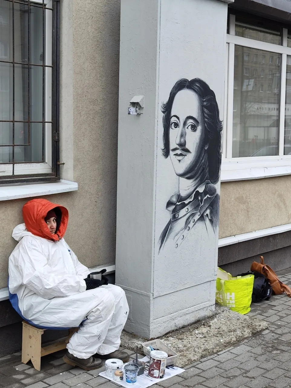 Теперь прохожие могут любоваться реалистичными черно-белыми портретами российского императора и знаменитого детского писателя.