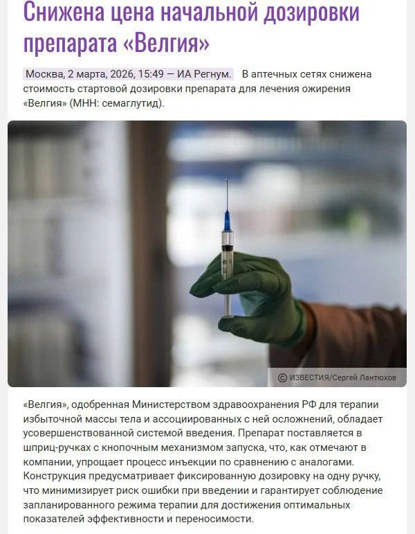 «Велгия» выпускается в шприц-ручках с кнопочным механизмом, а «Велгия эко» — в одноразовых автоинжекторах с фиксированной дозой, сообщает ИА Регнум.