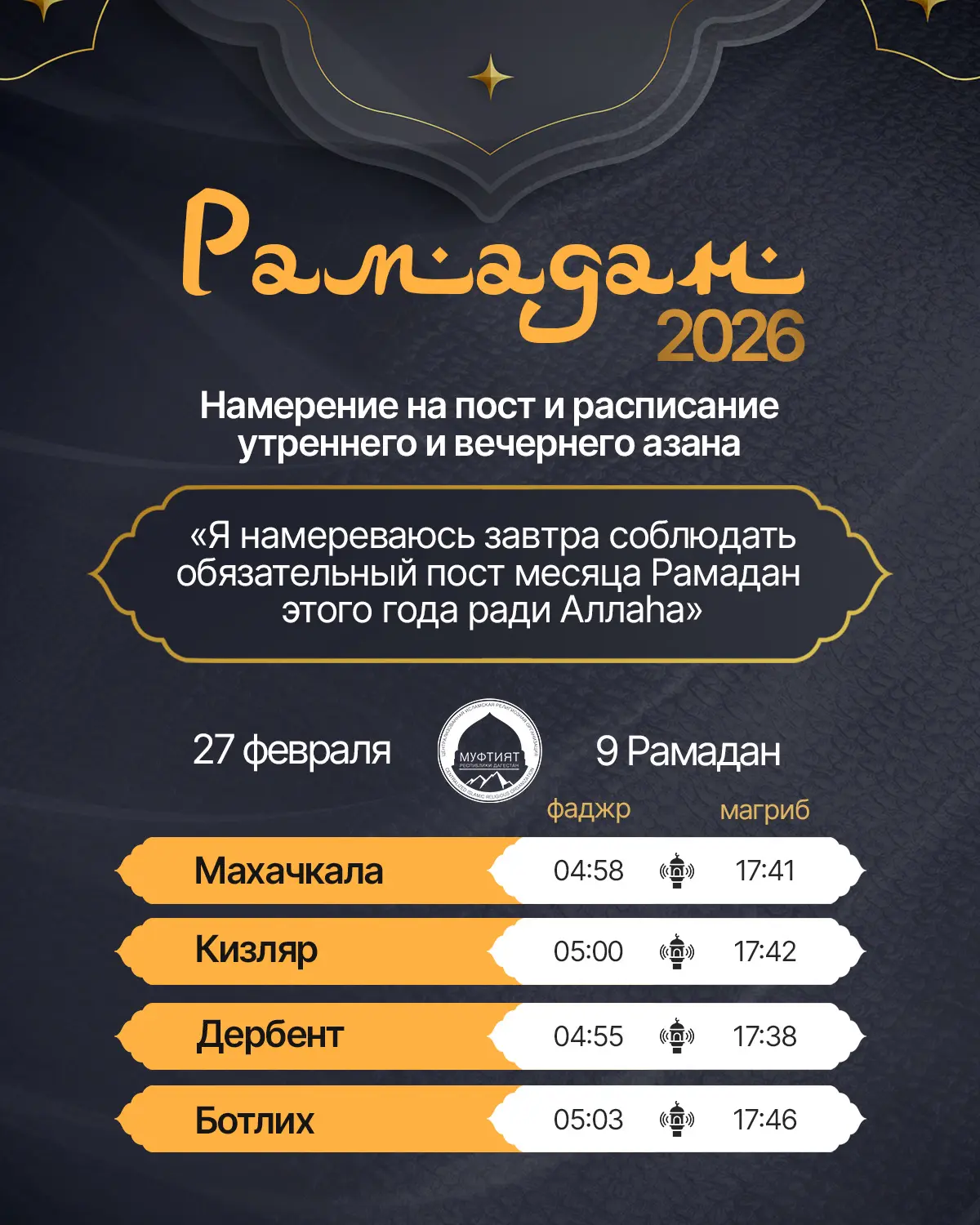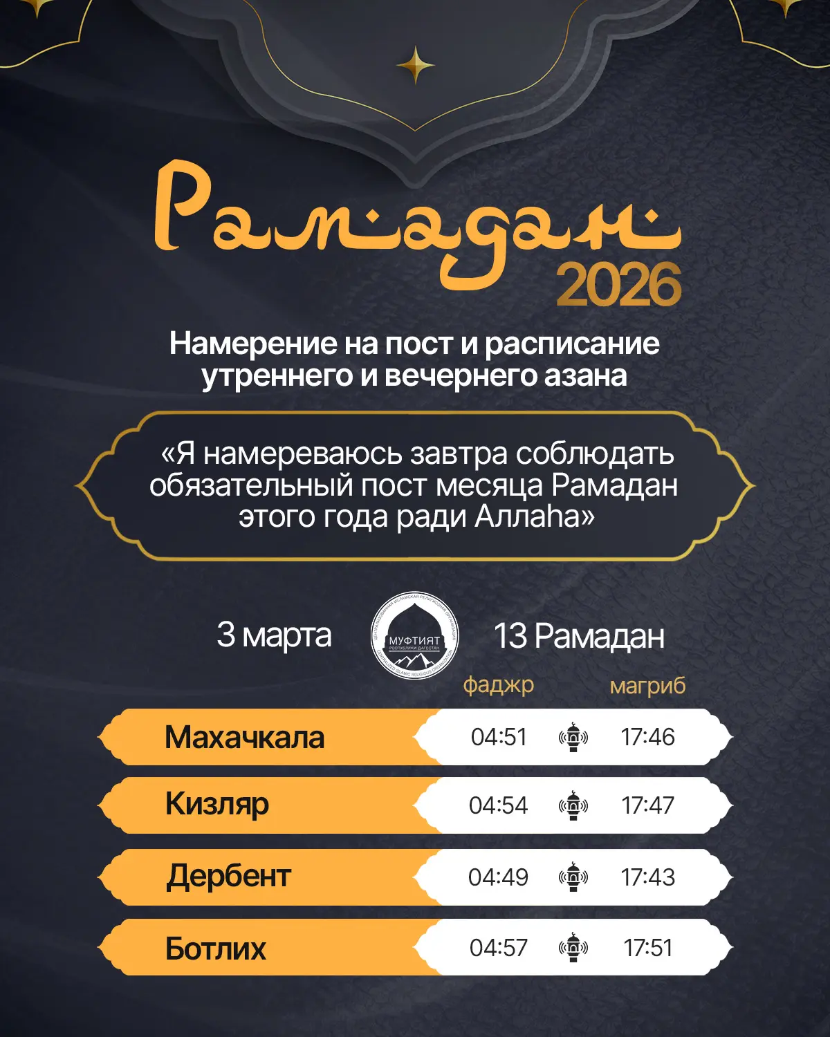 Намерение на пост и расписание утреннего и вечернего азана