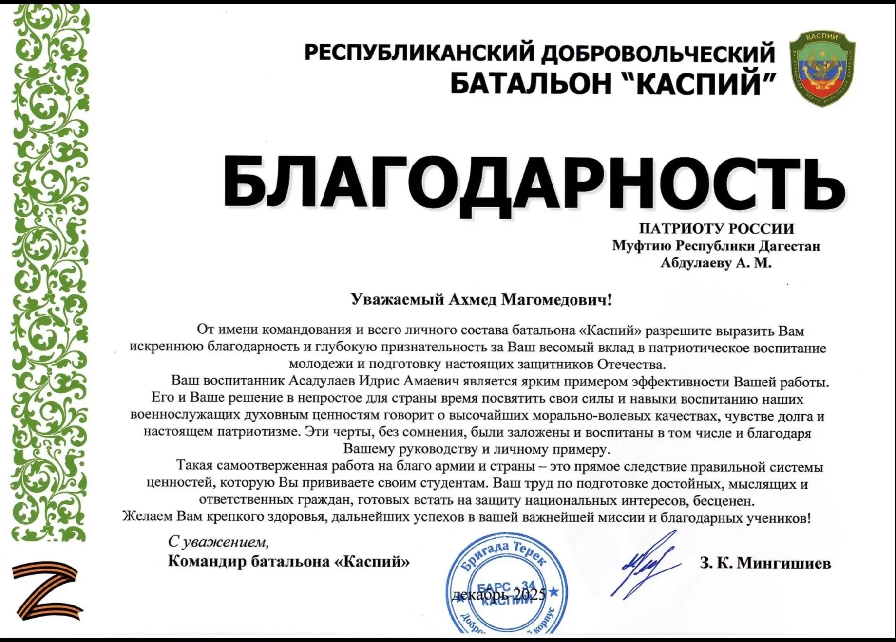 В адрес Муфтия Республики Дагестан, шейха Ахмада Афанди, от командования республиканского добровольческого батальона «Каспий» поступила благодарность за проводимую духовно-просветительскую работу и вклад в нравственное воспитание военнослужащих. В письме особо отмечена деятельность имама батальона Идриса Асадулаева, чьё служение является наглядным примером эффективного духовного наставничества и высокого уровня ответственности.
